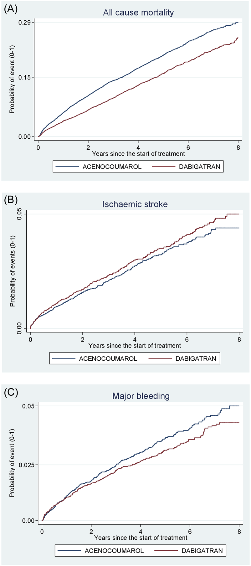 Figure 5. Acenocoumarol vs. dabigatran. Crude cumulative incidence or failure curves of (A) “all-cause mortality”, (B) “ischaemic stroke”, and (C) “major bleeding” (intracranial or gastrointestinal bleeding) according to initiated treatment.
