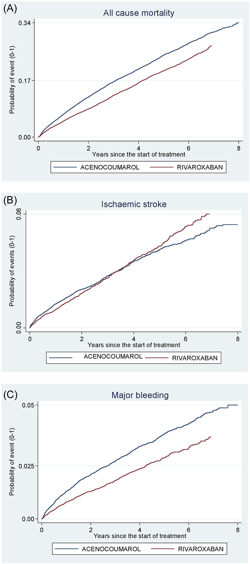 Figure 6. Acenocoumarol vs. rivaroxaban. Crude cumulative incidence or failure curves of (A) “all-cause mortality”, (B) “ischaemic stroke”, and (C) “major bleeding” (intracranial or gastrointestinal bleeding) according to initiated treatment.