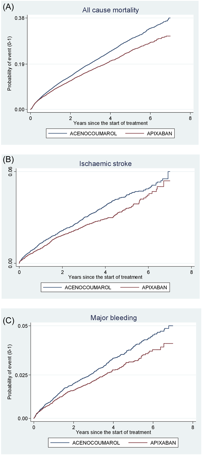 Figure 7. Acenocoumarol vs. apixaban. Crude cumulative incidence or failure curves of (A) “all-cause mortality”, (B) “ischaemic stroke”, and (C) “major bleeding” (intracranial or gastrointestinal bleeding) according to initiated treatment.