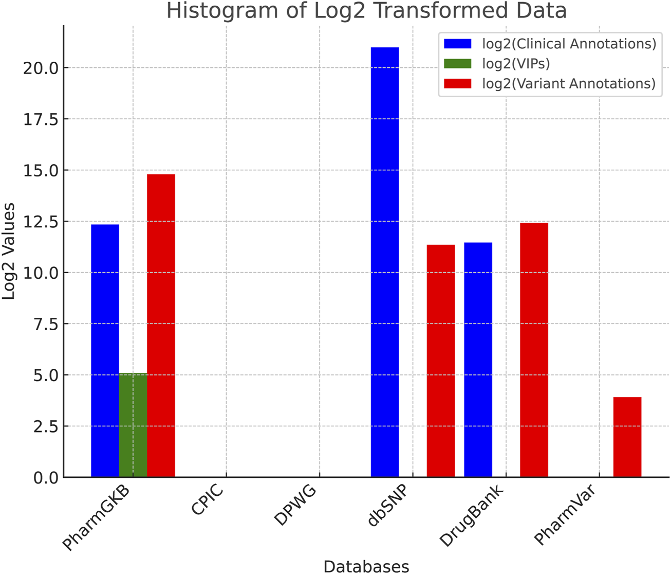 Figure 1. Normalized comparison of the mentioned databases, highlighting their relative strengths regarding the number of Clinical Annotations, Very Important Pharmacogenes (VIPs), and Variant Annotations for each database.