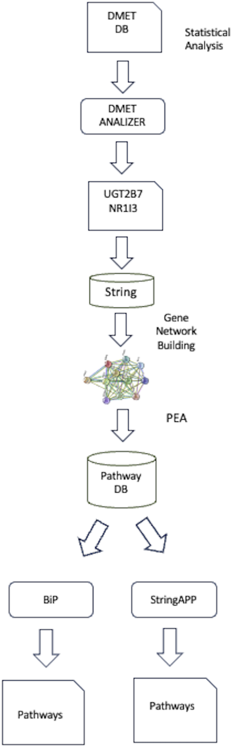 In this section we present an example of integrated analysis of identified SNPs correlated to taxane-related peripheral neurotoxicity (TrPN) in a retrospective case-control study on breast cancer (BC) patients (Arbitrio et al., 2019) based on the guidelines above described. Using DMET genotyping, we feed DMET-Analyzer with the raw DMET SNPs data set, to identify specific SNPs within these genes associated with TrPN, figuring out these tow genes UGT2B7 and NR1I3. The NR1I3 and UGT2B7 genes have been implicated in taxane neuroprotection due to a defect in the drug’s glucuronidation/clearance process related to ultrametabolizer phenotype with probable loss of efficacy, suggesting new potential biomarkers correlated to taxane neurotoxicity. These potential biomarkers could allow stratification of BC patients with interindividual TrPN predisposition for tailored prescription (Arbitrio et al., 2019). To further explore their biological significance, a network-based analysis was conducted using the STRING database to construct a gene interaction network, focusing on genes functionally related to UGT2B7 and NR1I3. Following, PEA was performed to link these genes to biological pathways involved in drug metabolism. The identified pathways were then modeled using a multilayer network approach, which allowed the integration of multiple interconnected pathways to better understand the complex roles of these genes in disease mechanisms and drug responses. This methodology highlights UGT2B7 and NR1I3 as potential biomarkers for predicting taxane toxicity, estrogen processing and neuroprotection and optimizing treatment strategies in precision medicine. Figure 3 summarizes the main step fo analysis, for complete details on methodology see Agapito et al. (2024).