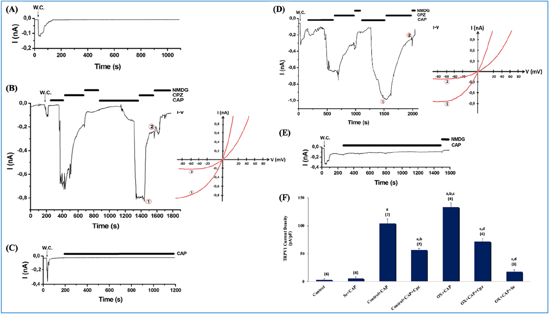 Current densities in DRGs isolated from OX and Se treated rats. The holding potential for these records was −60 mV. (A) Control (n = 6): These are patch-clamp records from rat DRGs that have not undergone any treatment. (B) Control-CAP group (n = 7): Unlike control, this group was stimulated with an agonist (TRPV1 specific agonist, CAP, 0.01 mM). It was also inhibited by Cpz (0.1 mM). (C) Se-CAP group (n = 4): DRGs of Se treated rats were stimulated by CAP. (D) OX-CAP group (n = 4): DRGs of OX treated rats were stimulated with CAP (TRPV1 agonist, 0.01 mM) using patch-clamp techniques. Inhibited by Cpz (0.1 mM). (E) OX-CAP-Se group (n = 3): TRPV1 currents were examined in the DRGs of OX and Se treated rats with using patch-clamp technique. CAP (0.01 mM) was used in stimulation and Cpz (0.1 mM) was used for inhibition. (F) In this graph, current densities in DRG cells were compared for all groups. n: this is the number of repetitions for each group (ap ≤ 0.00, 1 etc. than Control and Se; bp ≤ 0.001, etc. than Control + CAP; cp ≤ 0.001, etc. than CAP + Cpz; dp ≤ 0.001, etc. than OX + CAP). I-V means current-voltage relationship. NMDG, N-methyl-D-glucamine.