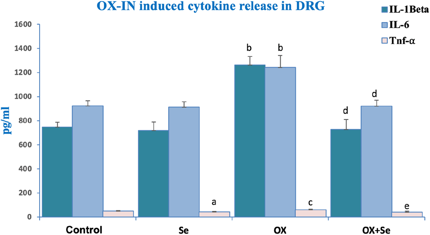 The effect of Se treatment on OX-induced cytokine release in DRG neurons. Effect of Se on IL-1 Beta secretion in OX-IN induced DRG neurons (bp ≤ 0.001, etc. than control and Se groups; dp ≤ 0.001, etc. than OX) (n = 6 and mean ± SD). Effect of Se on IL-6 levels in OX-IN induced DRG neurons (bp ≤ 0.001, etc. than control and Se; dp ≤ 0.001, etc. than OX) (n = 6 and mean ± SD). Effect of Se on TNF-α levels in OX-IN induced DRG neurons (ap ≤ 0.05, etc. than control; cp ≤ 0.05, etc. than Control and Se; ep ≤ 0.05, etc. than OX) (n = 6 and mean ± SD).