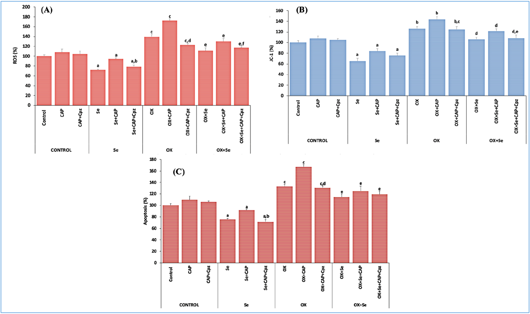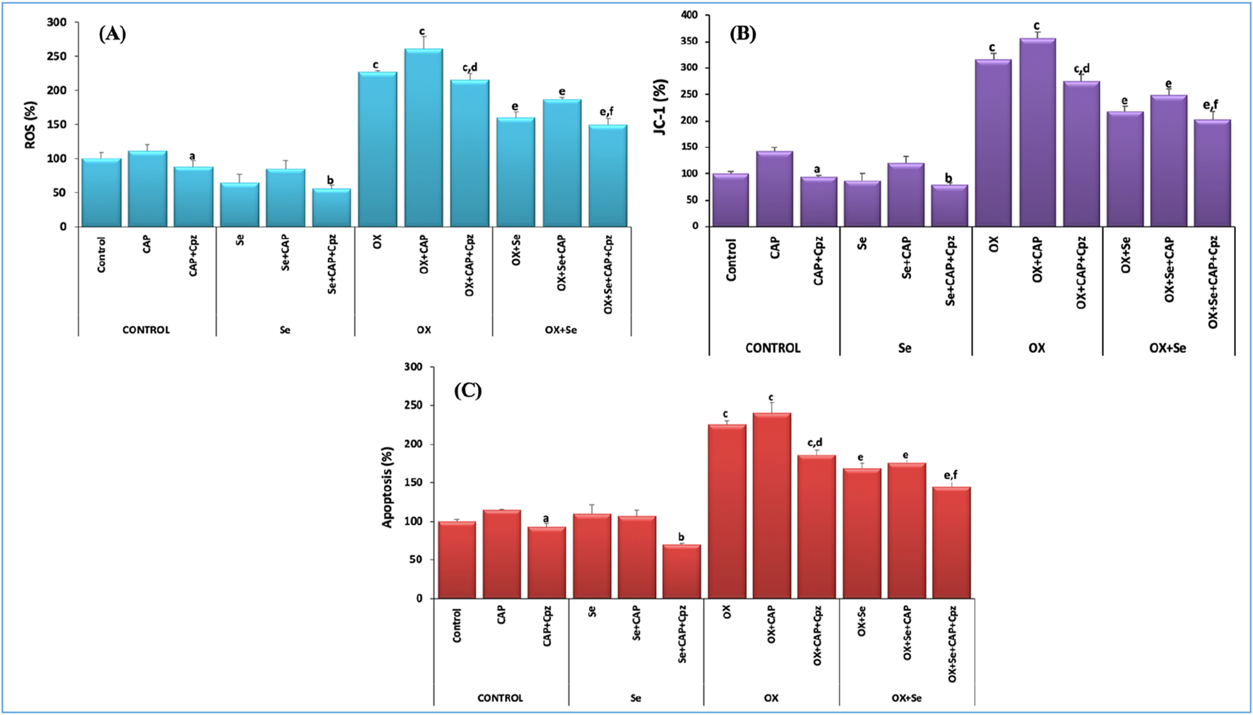 We repeated the in vitro apoptosis experiments using the MCF-7 cell line, and the obtained results concurred with the in vivo values. ROS, mitochondrial membrane depolarization (JC-1) and apoptosis levels were higher in the OX groups compared to the control (p ≤ 0.001). These values were significantly suppressed in the Se + OX and Se + Cpz groups (p ≤ 0.05) (Figure 7).