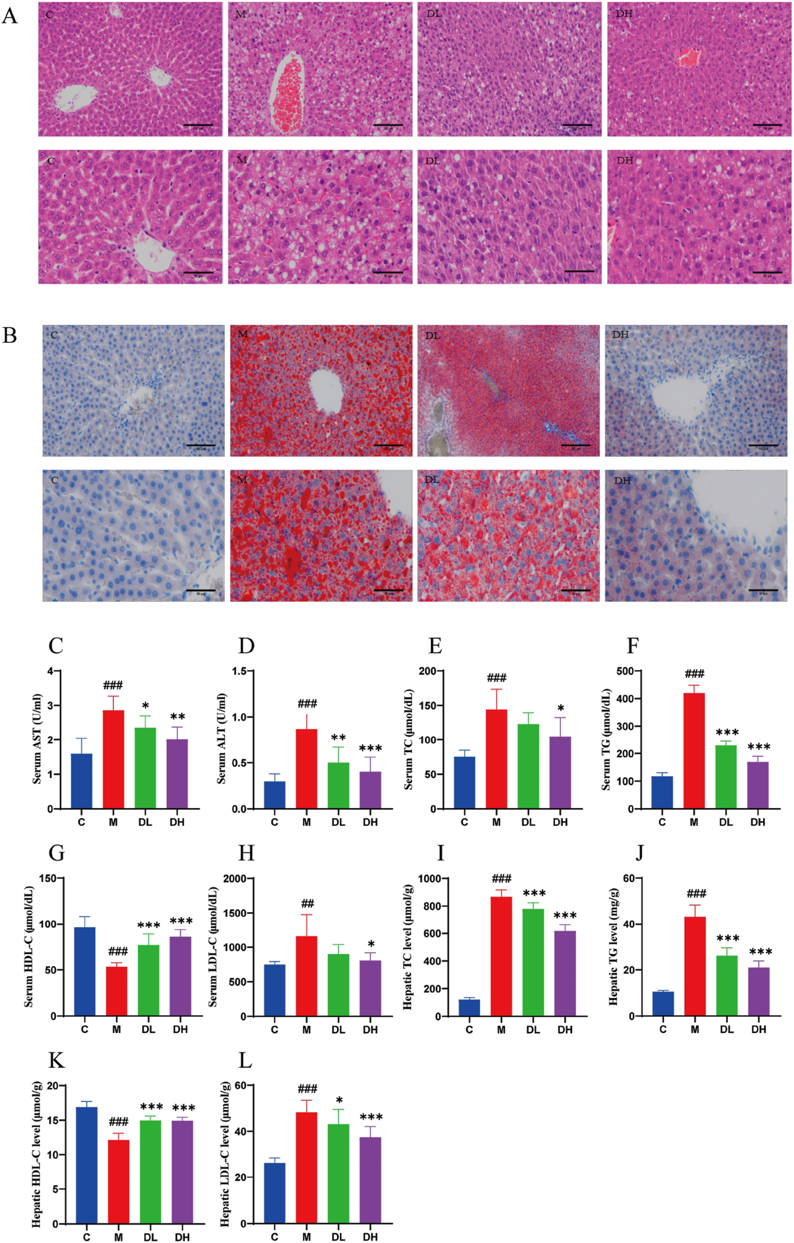 In order to ascertain whether the intervention of the total flavonoids of Dracocephalum moldavica L. would could be employed to improve liver injury and lipid accumulation induced by HFD, the liver tissues were stained with HE and Oil Red O. The results of the HE staining indicated (Figure 2A) that the hepatocytes in the livers of rats in the C group were arranged in a regular and tightly packed manner, whereas the liver tissues of the rats in the M group were obviously swollen, and the cytoplasm was filled with lipid droplets of large vacuoles and as well as small vacuoles of varying sizes and quantities. Additionally, inflammatory cell infiltration appeared in a localized area. Following the administration of the total flavonoids of Dracocephalum moldavica L., steatosis was significantly reduced in rats, and sporadic lipid droplets were observed within hepatocytes, and no inflammatory cell infiltration was observed in the DH group. The results of Oil Red O staining showed (Figure 2B) demonstrated the presence of numerous red, tiny lipid droplets of varying sizes with the cytoplasm of rat hepatocytes in the M group. These droplets were observed to fuse with each other, forming larger lipid droplets that occupied the majority or entirety of the cytoplasm. In comparison, the DL and C groups exhibited a reduction in the number of red lipid droplets, with fewer droplets observed in the DL group than in the M group. In the DH group, there were sporadic lipid droplets in the interstitial area of hepatocytes after administration of vanillin. The number of red lipid droplets was significantly reduced in comparison to that of the M group. These results indicated that vanillin administration significantly reduced lipid accumulation in the liver, attenuated hepatic steatosis, and exerted anti-inflammatory effects.