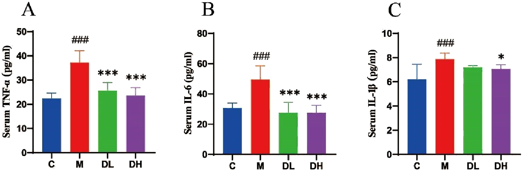 The effects of the total flavonoids of Dracocephalum moldavica L. on in flammation levels in rats of all groups. (A) Serum TNF-α level (n = 8). (B) Ser um IL-6 level (n = 8). (C) Serum IL-1β level (n = 8). Data are shown as mean v alues ± S. Compared with the C group,###P < 0.001, compared with the M gro up,*P < 0.05,***P < 0.001.