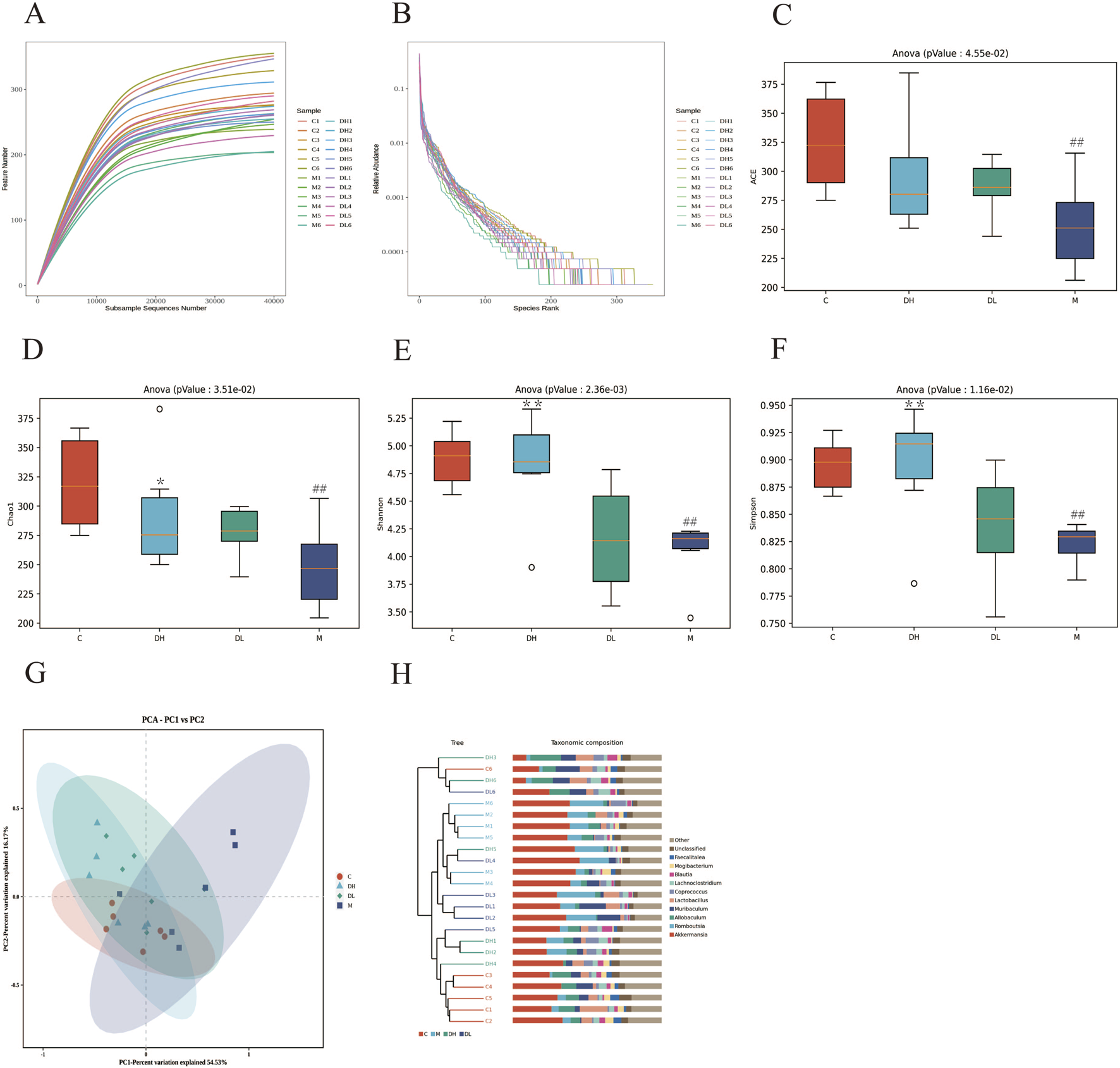 The effects of the total flavonoids of Dracocephalum moldavica L. on A lpha diversity and Beta diversity of gut microbiota of rats in various groups. (A) Sparsity curves (n = 6). (B) Abundance rank curves (n = 6). (C–F) ACE, Chao 1, Shannon, and Simpson indices (n = 6). (G) PCA analysis (n = 6). (H) Cluster t ree analysis (n = 8). Data are shown as mean values ± S. Compared with the C group,##P < 0.01, compared with the M group,*P < 0.05,**P < 0.01.