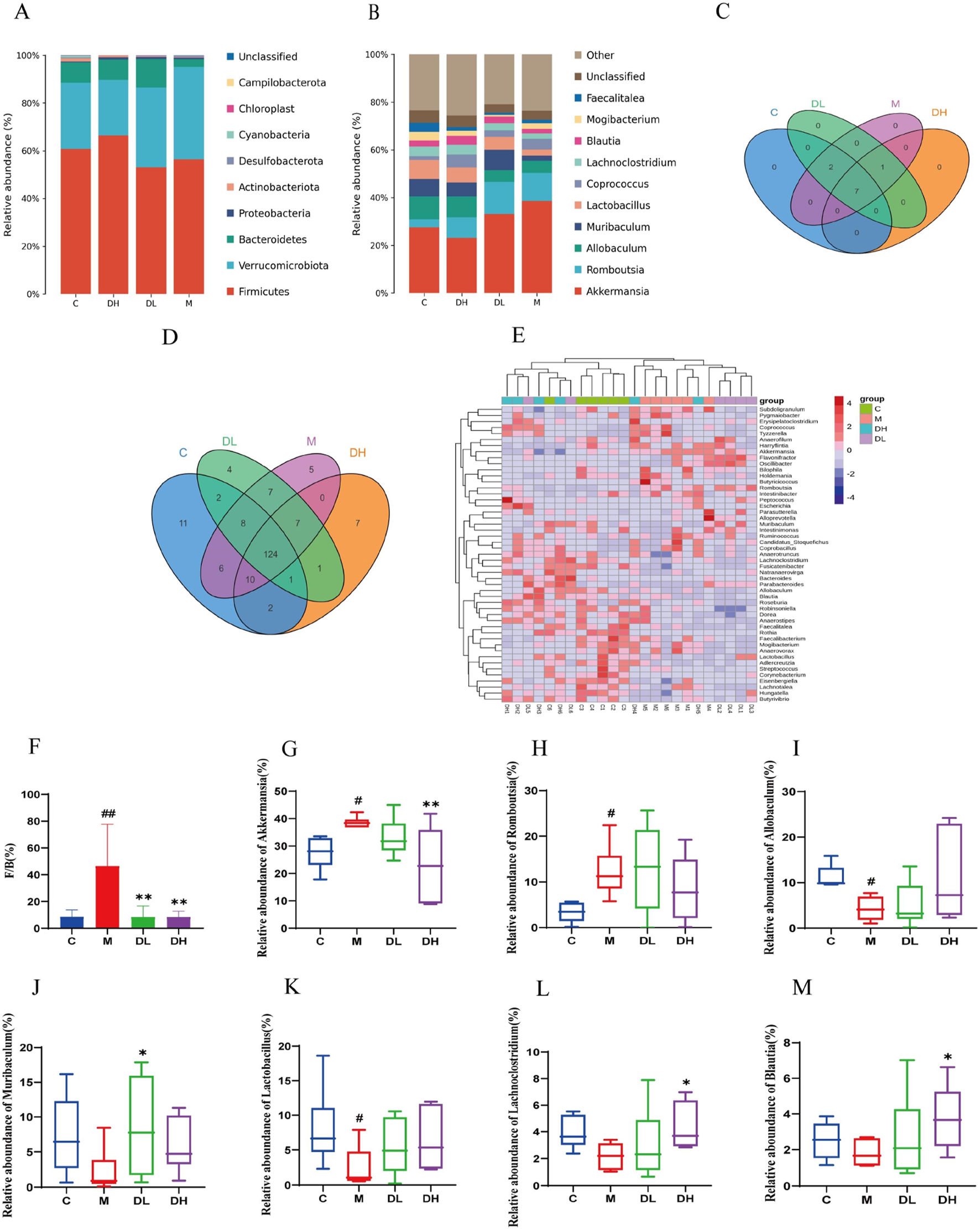 Effect of the total flavonoids of Dracocephalum moldavica L. on gut mic robiota at the phylum and genus levels. (A) Gate level(n = 6). (B) Genus level(n = 6). (C, D) Venn diagram at the phylum and genus levels(n = 6). (E) Heat map at genus level(n = 6). (F) Fimicute and Bacteroidete ratios (n = 6). (G–M) Relative abundance of Akkermansia, Romboutsia, Allobaculum, Muribaclum, Lactobacillu s, Lachnoclostridium, Blautia (n = 6). Data are shown as mean values ± S. Com pared with the C group,#P < 0.05, ##P < 0.01, compared with the M group,*P < 0.05, **P < 0.01.