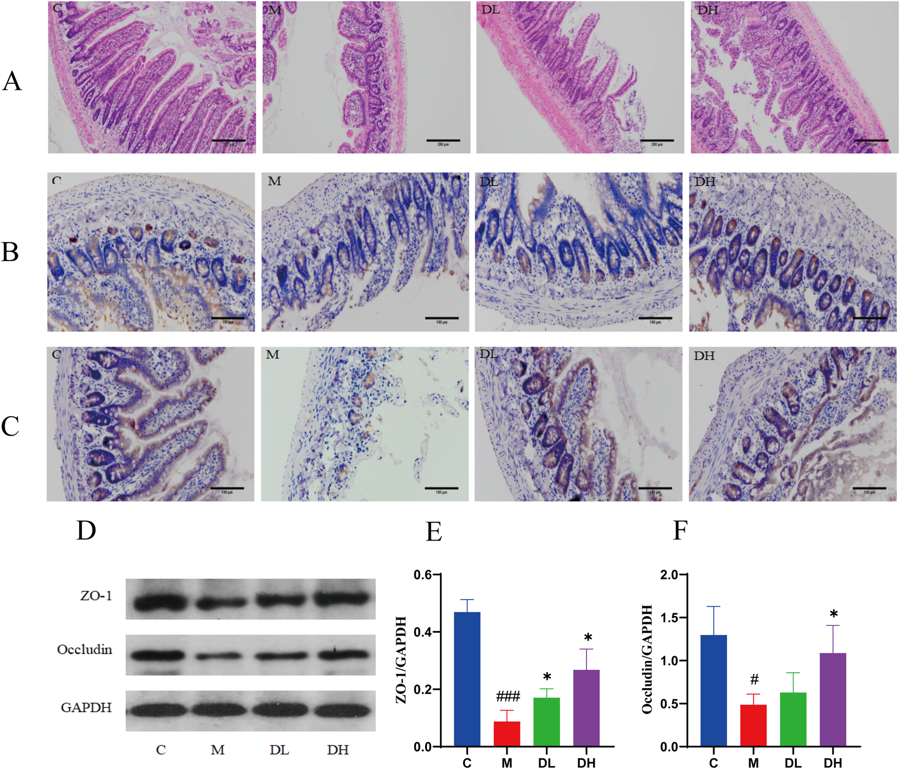 Pathological analysis was performed by HE staining of rats ileum to evaluate the effect of the total flavonoids of Dracocephalum moldavica L. on the intestinal barrier of rats after intervention. The results of HE staining showed (Figure 6A) that the ileal villi of rats in the M group were impaired in detachment and the intestinal glands were sparsely arranged with a higher inflammatory cell infiltration compared to those in the C group. After the treatment with the total flavonoids of Dracocephalum moldavica L., the structure of ileal villi was improved and the infiltration of inflammatory cell infiltration was reduced. The above results indicated that the total flavonoids of Dracocephalum moldavica L. inhibited intestinal epithelial necrosis, improved the structure of the intestinal villi, and effectively reduced the inflammatory cell infiltration in the intestinal mucosa of rats.
