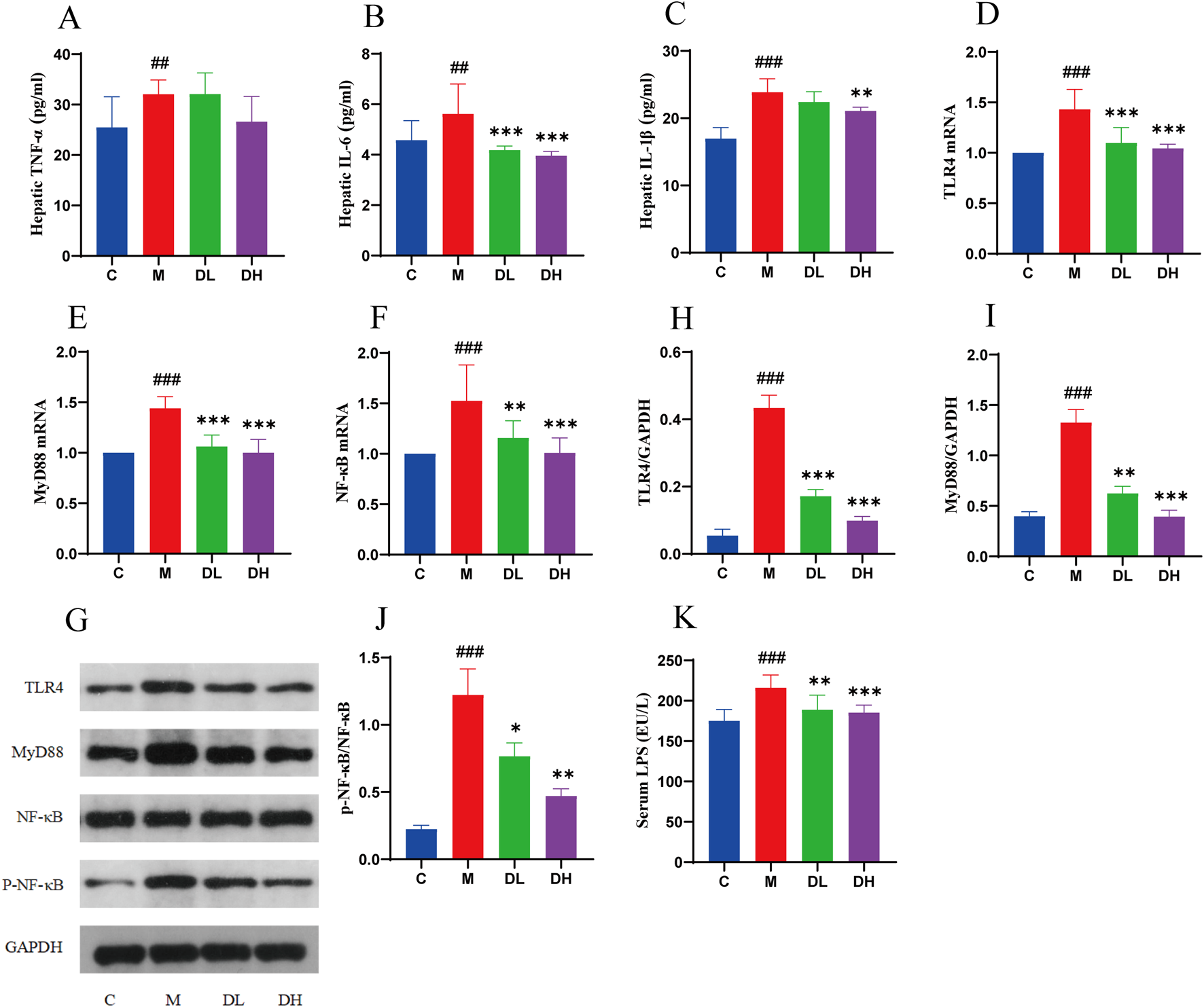 The total flavonoids of Dracocephalum moldavica L. ameliorate liver inflammation in MAFLD rats through TLR4/MyD88/NF- κB signalling pathway. (A–C) Hepatic TNF-α, IL-6, IL-1β levels(n = 6). (D–F) TLR4, MyD88, NF- κB mRNA livers(n = 6). (G–J) Expression levels of TLR4, MyD88, and p-NF- κB/NF- κB proteins in the liver(n = 3). (K) Serum LPS level (n = 8). Data are shown as mean values ± S. Compared with the C group,##P < 0.01,###P < 0.001, compared with the M group,*P < 0.05,**P < 0.01,***P < 0.001.