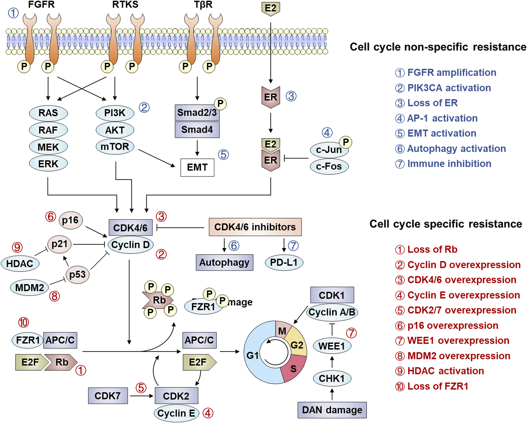 Mechanism of resistance to CDK4/6 inhibition. Several mechanisms of resistance to CDK 4/6 signaling have been established, including cell cycle specific resistance and cell cycle non-specific resistance.