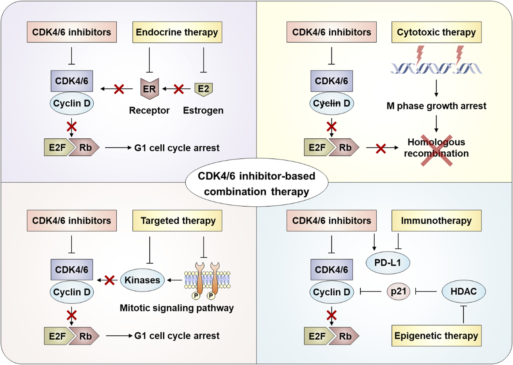 Cytotoxic therapies (e.g., radiotherapy, chemotherapy) exert antitumor effects by disrupting critical cellular processes such as DNA replication and protein synthesis in cancer cells (Kornepati et al., 2023). Combining chemotherapy with CDK4/6 inhibitors post-resistance shows therapeutic potential due to their non-overlapping resistance mechanisms. Mechanistically, CDK4/6 inhibitors induce tumor cell cycle arrest and apoptosis, while chemotherapy-induced DNA damage may sensitize tumors to cell cycle-targeted therapies (Bisi et al., 2016; He et al., 2017). However, chemotherapy’s dose-limiting hematologic toxicities (e.g., bone marrow suppression) often restrict its clinical utility. Notably, co-administration of CDK4/6 inhibitors may protect hematopoietic stem cells from chemotherapy-induced myelotoxicity (Bisi et al., 2016; He et al., 2017). Preclinical models demonstrate enhanced efficacy when microtubule stabilizers or DNA-damaging agents precede CDK4/6 inhibition, as suppressed E2F target gene expression impairs homologous recombination-mediated DNA repair (Dean et al., 2012; Salvador-Barbero et al., 2020). Additionally, Rb-independent effects of CDK4/6 inhibitors—such as blocking phosphorylation of FOXM1 and FOXO3—further compromise DNA repair capacity post-chemotherapy or radiotherapy across diverse tumor types (Hashizume et al., 2016).