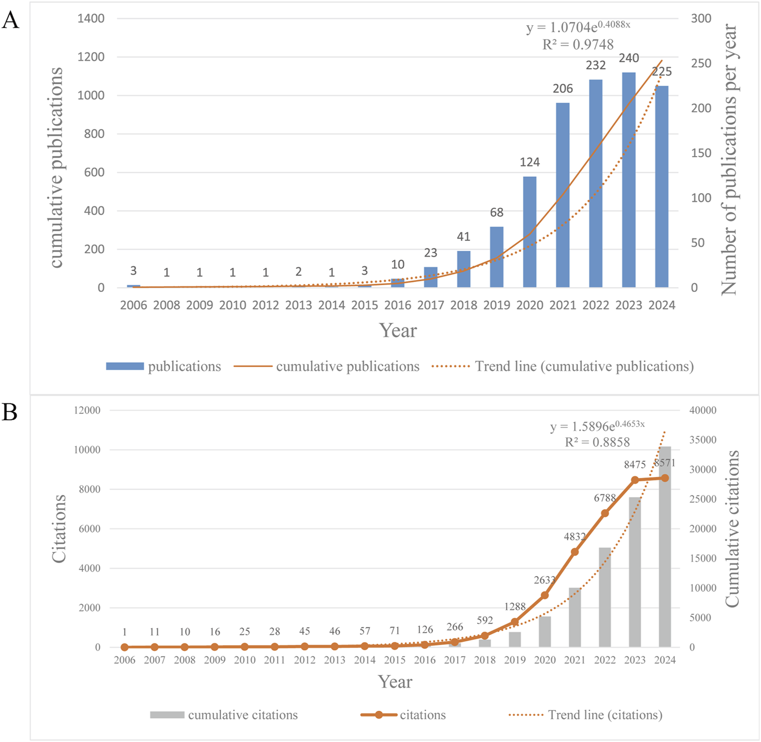 (A) Annual and cumulative publications from 2006 to 2024, and the trend line of annual publications. It should be noted that the articles we analyzed were published up to 23 October 2024, so the publications of this year are incomplete and lower compared to the previous year, but the prediction still shows an upward trend. (B) Annual and cumulative citations from 2006 to 2024, and the trend line of annual citations.
