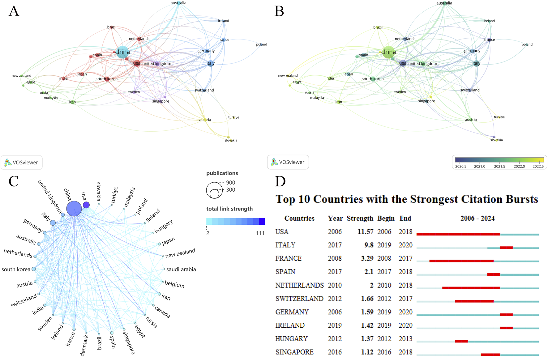 (A) Countries/regions network visualization. (B) Countries/regions overlay visualization. The size of the nodes also represents the publications of each country, and the color of the nodes reflects the average time of publication. (C) The chord diagram for countries/regions partnership. The United States has significantly fewer publications than China but has stronger cooperation with other countries and a higher Total link strength. (D) Top 10 countries with the strongest citation bursts.