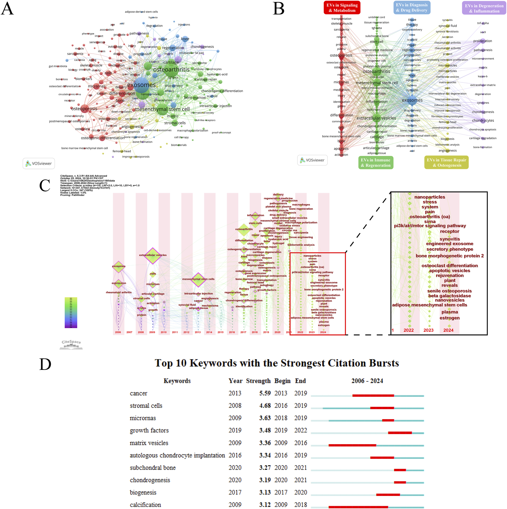 Keywords often reflect the core content of an article. Through keyword co-occurrence analysis, research hotspots in a specific field can be identified. Using VOSviewer, a keyword co-occurrence network view was drawn for 1,182 publications, visualizing keywords with a frequency of eight or more (Figure 4). Table 2 shows the top 30 keywords by frequency. Figures 4A, B reveal the frequency of keywords and the results of cluster analysis, the top three keywords are exosomes, osteoarthritis and extracellular vesicles. Five clusters are generated which can represent the five main research directions in this field. The average year of keyword occurrence can be used to understand the frontiers and hotspots in this field (e.g., drug delivery, hydrogel, oxidative stress, nanoparticles, bone regeneration, macrophage polarization, sarcopenia, intervertebral disc degeneration, etc.) (Supplementary Figure 3A). The current high research interest in exosomes combined with new biomaterials makes exosomes and hydrogels appear close to each other in the density visualization (Supplementary Figure 3B). Many new keywords began to appear after 2016, and most of them were heavily cited during this period (Supplementary Figures 3C, D). This indicates that the field is an emerging research area, with continuous advancements and numerous new research directions, aligning with the surge in publications. Figure 4C illustrates the evolving research themes over time by tracking changes in keywords from 2006 to 2024. Figure 4D is the top 10 keywords with strongest citation burst, which reveals the changing trends of research hotspots in this academic field over time. It also highlights which keywords gained more citations during specific periods, reflecting the academic community’s focus on these topics.