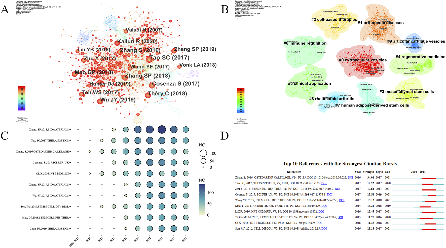 This section analyzes the field’s development process and the evolution of research hotspots through co-cited references and citation bursts. The co-cited reference analysis was conducted using CiteSpace (Figure 5). Table 3 lists the top 10 most-cited articles. These highly cited articles often reflect major discoveries and research achievements in the field at the time. Analyzing them provides valuable insights into the field’s developmental process. Figure 5A shows the cited articles and the co-citation relationships among them. In Figure 5B, each cluster represents a research topic or field, and the title of each cluster summarizes its main research topic. There are a total of 10 clusters: 0# (extracellular vesicles), 1# (orthopedic diseases), 2# (cell-based therapy), 3# (Mesenchymal stem Cells), 4# (regenerative medicine), 5# (clinical application), 6# (immune regulation), 7# (human adipose-derived stem cells), 8# (rheumatoid arthritis), 9# (articular cartilage vesicles). The two most active clusters are 0# (extracellular vesicles) and 1# (orthopedic disease), each containing over 100 keywords. As shown in Figure 5C, a sudden sharp increase in citations often indicates that the article has likely addressed a significant issue in the research field. Figure 5D shows the top 10 references in citation burst analysis. Most articles are heavily cited in 2016 ∼ 2018 when this research field was rapidly growing.