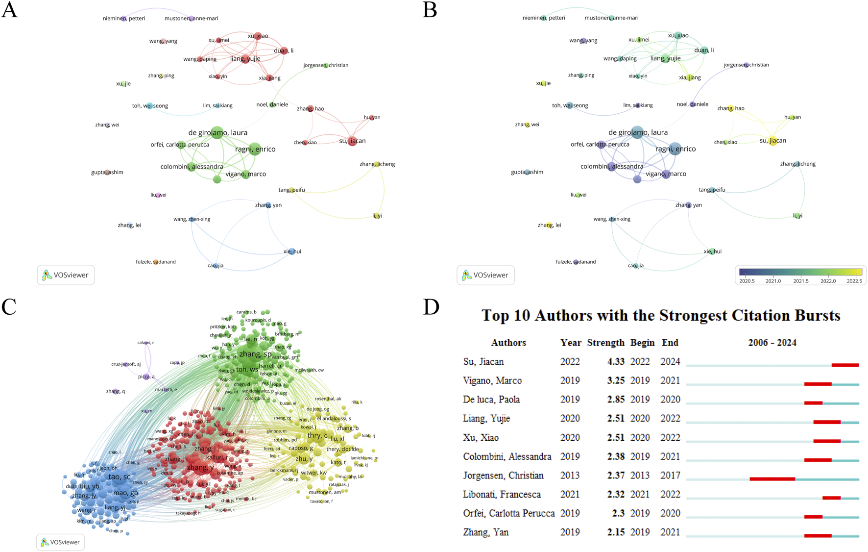 (A) Keyword network visualization. Circles and labels form the nodes, and the size of the node represents the frequency of the keyword, the higher the frequency, the larger the node. (B) Analysis of Keyword Clustering. The lines between the nodes represent the association strength between keywords. The color of the nodes represents their clusters, with different colors representing different clusters, divided into five clusters based on different research directions. (C) Temporal overlay visualization of the keyword co-occurrence network. The position of the nodes reflects the first appearance year of the corresponding keywords, the size of the nodes reflects the frequency of keyword occurrences, and the annual ring color reflects all years of keyword occurrence. The zoomed-in image shows the keywords that have emerged in the past 2 years. (D) Top 10 keywords with the strongest citation bursts.