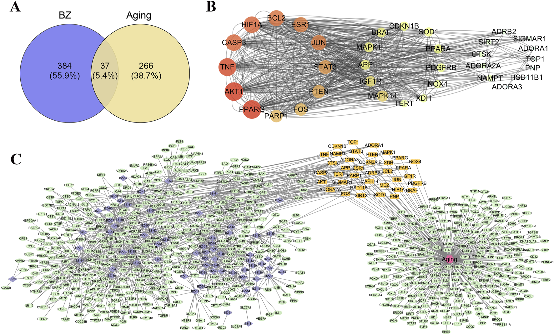 The genes of targets related to “senescence” or “aging” or “anti-aging” were screened via Durgbank (http://www. drugbank. ca/), Malacards (https://www.malacards.org/), TTD (http://db.idrblab.net/ttd/), and OMIM (https://www.ncbi.nlm.nih.gov/omim). After removing the duplicate genes, the common targets of the above keywords are collected as candidates. The BZ and aging targets, including their full names, abbreviations, and gene IDs, were obtained from the Uniprot database (https://www.uniprot.org/).
