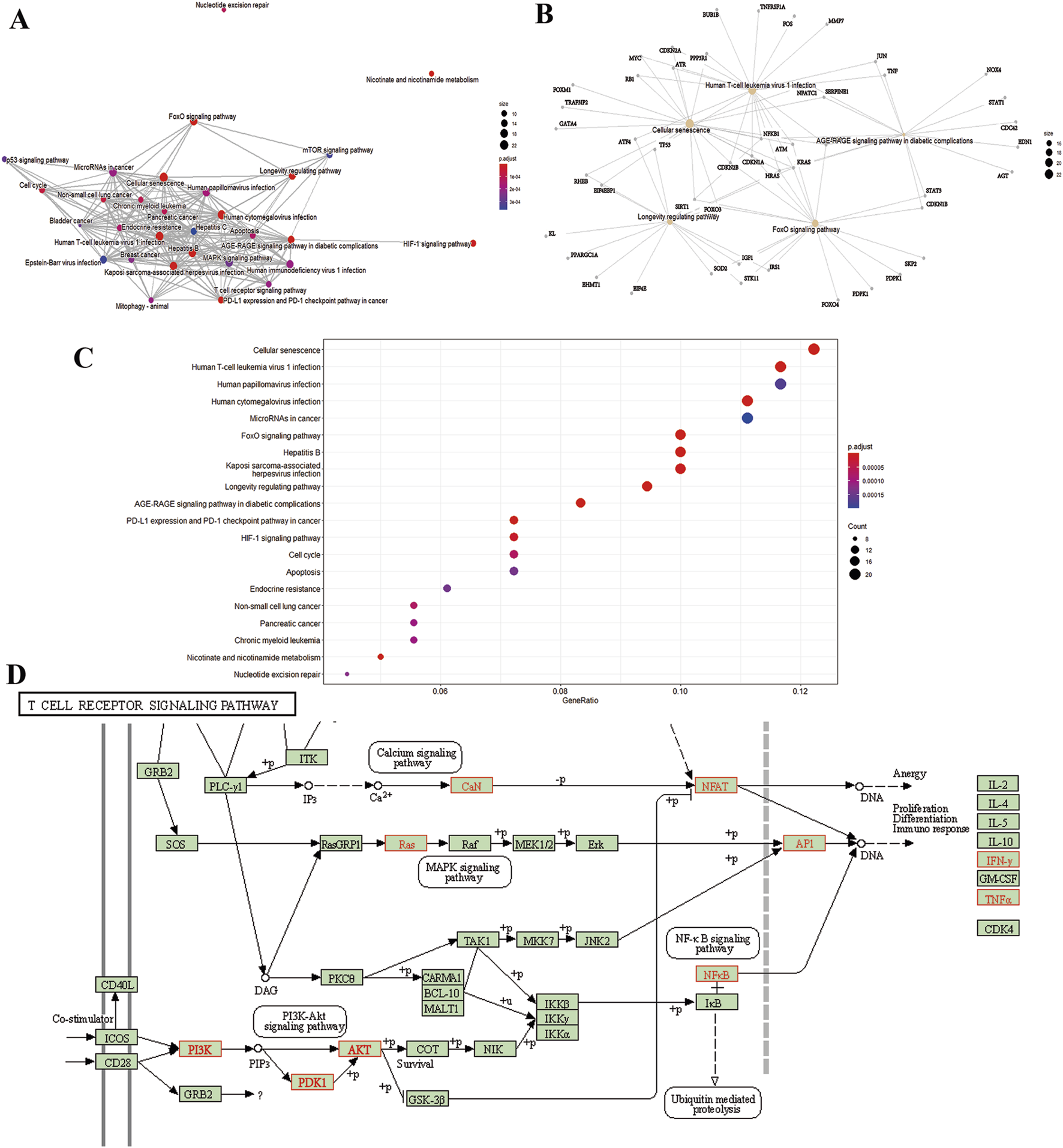 The aging of the immune system affects both the innate and adaptive immune systems. Natural killer (NK) cells constitute an important effector cell population in the innate immune system. Adaptive immune cells are broadly categorized into T and B lymphocytes. They are distributed throughout the body and, upon antigenic stimulation, activate, divide, proliferate, and initiate specific immune responses. With increasing age, T, B, and NK lymphocytes exhibit signs of senescence, such as disrupted subpopulation cell ratios and dysfunctional cellular responses, leading to impairments in immune response and immune function (Rebeca et al., 2011). In particular, T cells have been the main focus of immunosenescence. (Maria and Guido, 2021). A major division has also been made between T cells that are helpers (Th) and those that are cytotoxic (Tc). Th and Tc cells can be categorized as naïve, memory, or effector T cells, based on their differentiation stage (Snell et al., 2016; Monica et al., 2022). As the body ages, the thymus atrophies, leading to impairments in the development, differentiation, and maturation of T cells. This manifests as a decrease in the number of naive T cells exported from the thymus to the periphery, accompanied by an increase in memory T cells. These cellular changes can reduce the immune response level of elderly individuals to new antigens. The decline of CD8+T cells during senescence was more pronounced than that of CD4+T cells. The lack of CD28 expression in CD4+ and CD8+T cells among the elderly is a significant change associated with aging and senescence-related functional processes in human T cells. TH cells can differentiate into subpopulations of helper T cells 1 and 2 (Th1, Th2), Treg cells, and so on under different activation conditions. Th1 and Th2 cells interact with and regulate each other. The increased senescence of peripheral blood T cells leads to higher levels of pro-inflammatory cytokines (IFN-γ, TNF-α, IL-6) and lower levels of anti-inflammatory cytokines (IL-2, IL-4, IL-10) (Cornelia M et al., 2013). CD4+CD25+Foxp3+ Treg cells are the most characteristic Treg cells, capable of inhibiting the proliferation and activation of effector T cells, reducing cytokine secretion, and thereby regulating immune responses to exert immunosuppressive effects. With increasing age, the number of Treg cells increases, and its ability to suppress lymphocyte function by inhibiting lymphocyte activation receptors also enhances (Sanjay et al., 2013). T cells rely on multiple downstream signaling and metabolic pathways to maintain homeostasis and respond appropriately to TCR and cytokine stimulation during activation. Aging disrupts these pathways, most notably by hyperactivating basal signaling pathways in resting T cells, such as an increased basal activation of the PI3K/AKT signaling pathway. NF-κB is a signaling pathway involved in inflammatory responses, and the hyperactivation of the PI3K/AKT pathway can activate nuclear NF-κB, leading to inflammatory reactions that contribute to aging (Carrie et al., 2013).