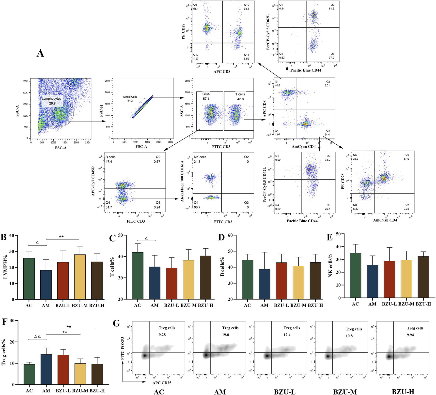 Lymphocyte regions were identified based on their forward scatter (FSC) and side scatter (SSC) characteristics. Non-adhered cells were excluded by FSC-W and FSC-H measurements. The panels define the proportion and total number of major groups as follows: NK cell panel (CD3, CD161a); B cell subset panel (CD3, CD45RA); T cell subset panel (CD3); T helper cells (Th, CD3, CD4); T cytotoxic cell (Tc, CD3, CD8A); naïve, memory, or effector Th and Tc cells panel (CD3, CD4, CD8, CD44, CD62L). Moreover, the expression of CD28 was checked in the subpopulations CD4 and CD8. The expression of Treg cells (CD4+CD25+Foxp3+) was detected.