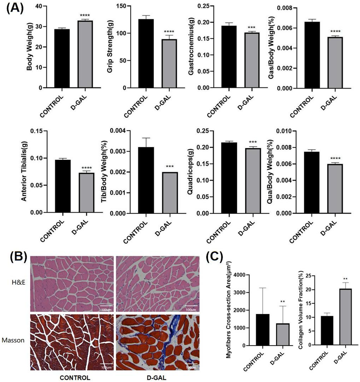 (A) Body weight, muscle strength, and the weight of lower limb skeletal muscles (gastrocnemius, tibialis anterior, quadriceps) and their percentage of the body weight of C57BL/6 mice(CONTROL vs. D-GAL) (B) The HE and Masson staining of limb skeletal muscle(CONTROL vs. D-GAL) (C) the statistical analysis of, myofiber cross sectional area (CSA) and collagen volume fraction (CVF) (compared to control group, *p < 0.05, **p < 0.01, ***p < 0.001, **** p < 0.0001).