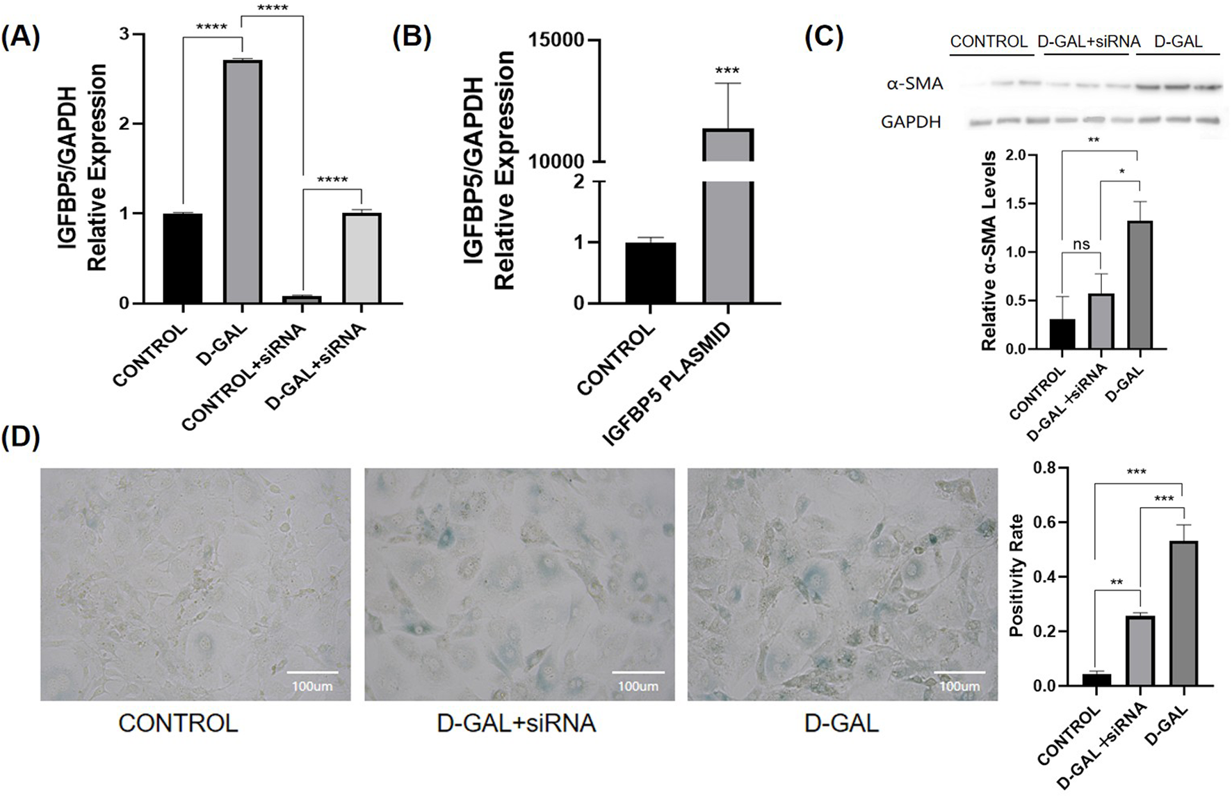 (A) The PCR of IGFGP5 (CONTROL vs. D-GAL vs. CONTROL + siRNA vs. D-GAL + siRNA); (B) The PCR of IGFBP5 (CONTROL vs. PLASMID) (C) Western blot of α-SMA and the statistical analysis (D) SA-β-gal staining of NOR-10 and the statistical analysis (CONTROL vs. D-GAL + siRNA vs. D-GAL) (compared to control group, *p < 0.05, **p < 0.01, ***p < 0.001, **** p < 0.0001).