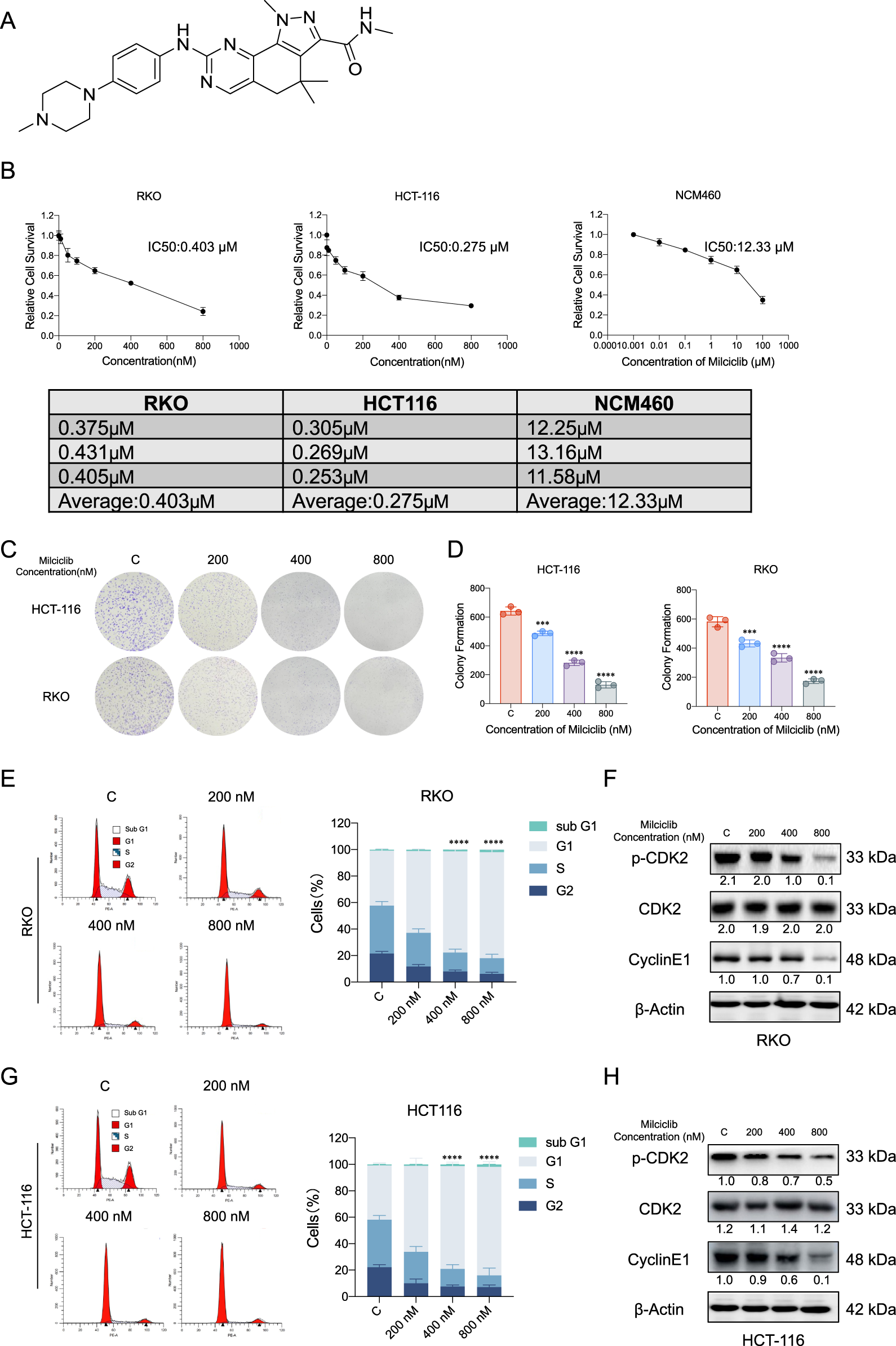 Figure 2. Milciclib blocks G1/S phase of the cell cycle in a dose-dependent manner (A). Chemical structure of Milciclib (B). The IC50 of Milciclib in RKO, HCT116 and NCM460 cells (C, D). Colony formation assay of CRC cells treated with varying concentrations (0 nM, 200 nM, 400 nM, and 800 nM) of Milciclib (E, G). Flow cytometry analysis indicates Milciclib-induced G1 phase arrest in CRC cells (F, H). Western blot analysis shows the inhibition of cell cycle-related proteins in CRC cells mediated by Milciclib. The statistical significance shown in the figure is compared to the control group. *P < 0.05, **P < 0.01, ***P < 0.001, ****p < 0.0001.