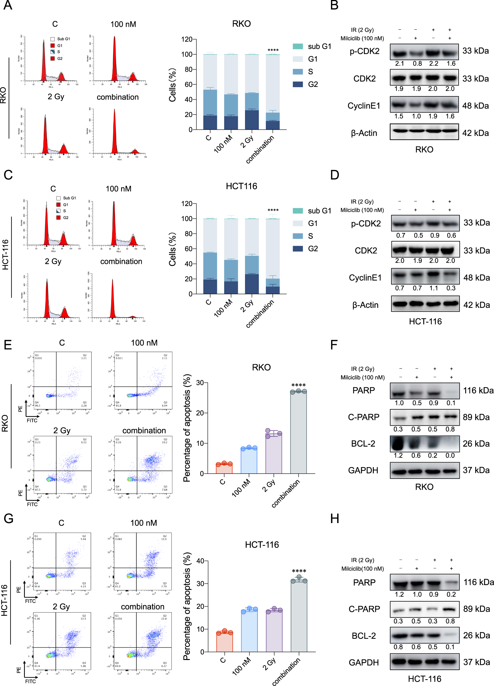 Figure 4. Combination therapy of Milciclib and radiotherapy enhances apoptosis in CRCs (A, C). The combination of Milciclib and radiotherapy induces G1/S phase cell cycle arrest (B, D). Changes in cell cycle-related proteins caused by the combination of Milciclib and radiotherapy (E, G). The combination of Milciclib and radiotherapy increases the apoptosis rate in CRC tumor cells (F, H). The combination of Milciclib and radiotherapy alters the levels of apoptosis-related proteins. The statistical significance shown in the figure represents comparisons between the combined radiotherapy and drug treatment group versus the radiotherapy-only and drug-only treatment groups, respectively. *P < 0.05, **P < 0.01, ***P < 0.001, ****p < 0.0001.