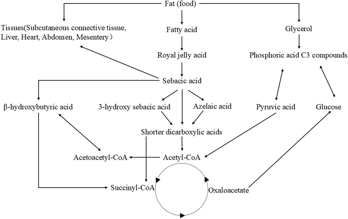 Fat metabolism plays a crucial role in maintaining homeostasis within the body (Hansen, et al., 2013). Royal jelly acid undergoes a series of metabolic transformations. Initially, it is metabolized into sebacic acid (SA), which exhibits various physiological activities (Liao, et al., 2024). Subsequently, SA is further broken down into short-chain dicarboxylic acids. These dicarboxylic acids can enter the tricarboxylic acid cycle to release substantial amounts of energy or participate in further metabolic reactions with other bodily substances (Bharathi, et al., 2020). It has been reported that the oxidation of sebacic acid can yield 61 ATP (445.3 kcal/mol), while royal jelly acid may generate over 61 ATP (Liao, et al., 2024). In addition to energy provision, succinate, oxaloacetate, and citrate produced via the tricarboxylic acid cycle play crucial roles in maintaining physiological homeostasis. For instance, citrate synthesis contributes to reduced ketogenesis (Iaconelli, et al., 2010). Furthermore, certain metabolites may continue to release energy through gluconeogenesis (Roden, et al., 2000). Figure 2 presents the metabolic pathways of royal jelly acid. It provides a detailed visualization of royal jelly acid’s metabolic journey.