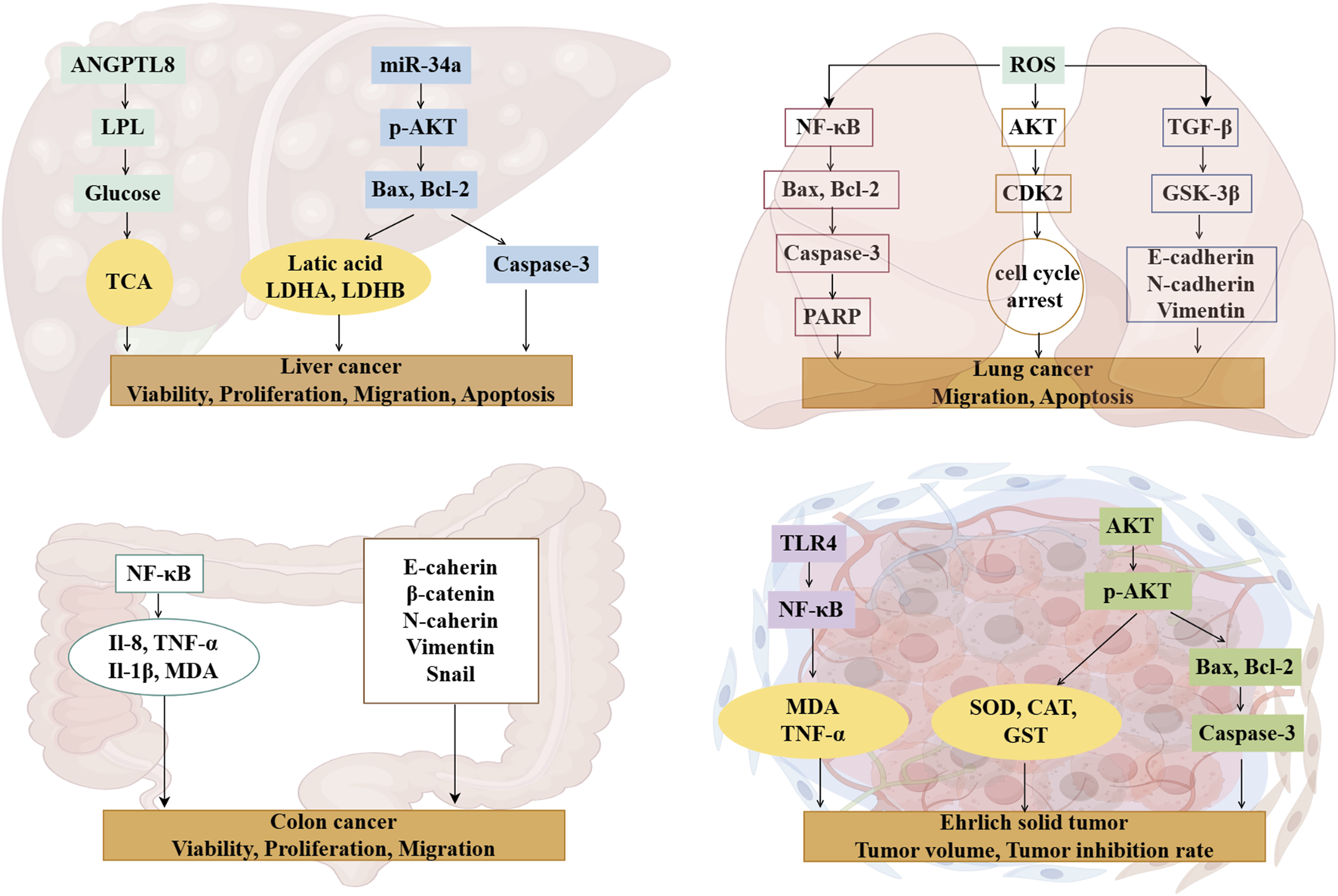 Figure 3. Mechanisms of royal jelly acid on cancer diseases. Royal jelly acid exhibits potential therapeutic benefits against various cancers. In liver cancer, it demonstrates therapeutic potential by modulating key regulators including lactic acid, Caspase-3, and Bax to improve liver cell viability, proliferation, migration, and apoptosis. In lung cancer, royal jelly acid regulates apoptosis-related factors (Bax, Bcl-2, Caspase-3), antioxidant factor (ROS), and anti-inflammatory factor (NF-κB), thereby influencing lung cancer cell migration and apoptosis. For colon cancer, royal jelly acid modulates inflammatory factors (NF-κB, IL-8, IL-1β, TNF-α) and junctional proteins (E-cadherin, β-catenin, N-cadherin), which collectively regulate colorectal cancer cell viability, proliferation, and migration. In Ehrlich solid tumors, royal jelly acid exerts anticancer effects by regulating antioxidant factors (SOD, MDA, CAT) and apoptosis-related factors (Caspase-3, Bax, Bcl-2), leading to reduced tumor volume and enhanced inhibition rate. These findings highlight that royal jelly acid exhibits therapeutic potential against cancer. Created by Figdraw.