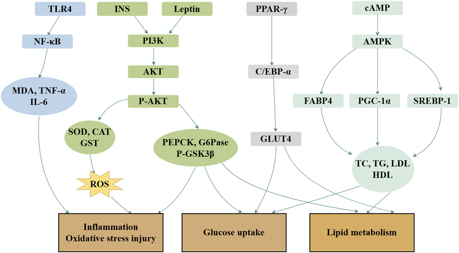 Figure 4. Mechanisms of royal jelly acid on glucolipid metabolic diseases. In glucolipid metabolic diseases, royal jelly acid demonstrates therapeutic potential through multi-target regulatory effects. It modulates lipid factors (TC, TG, LDL, HDL), anti-inflammatory factors (TNF-α, IL-6), and antioxidant factors (SOD, CAT, GST), thereby ameliorating inflammation, oxidative stress injury, glucose uptake, and lipid metabolism dysregulation. Created by Figdraw.