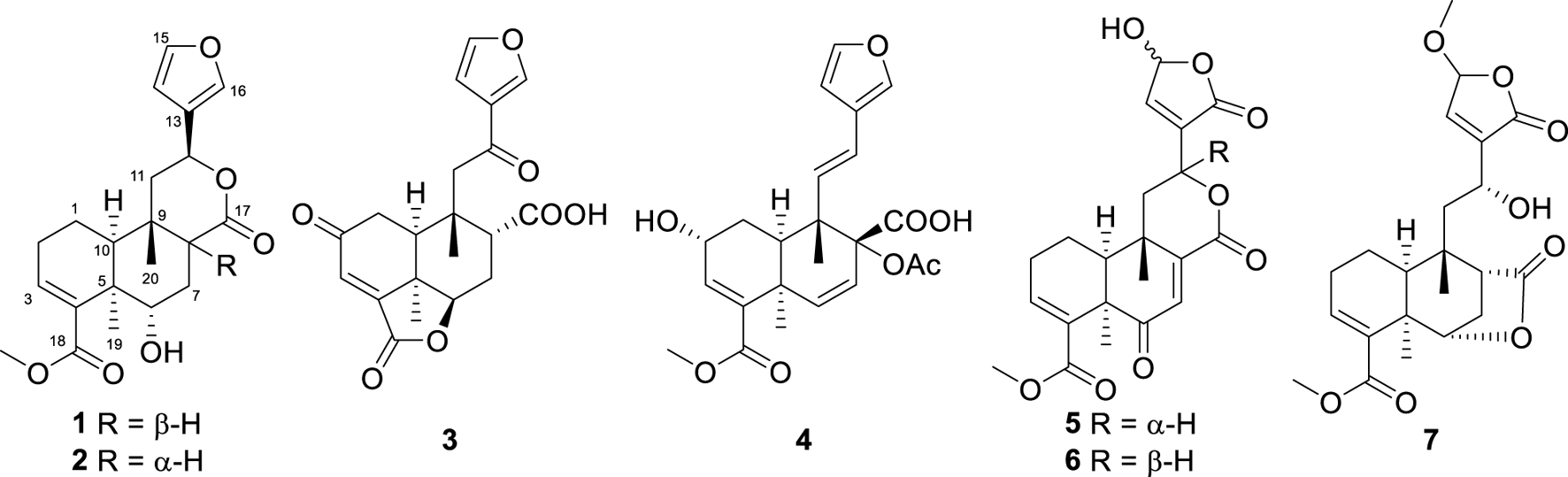 The Tinospora genus is abundant in clerodane diterpenoids (Zhang J.-S. et al., 2021; Zhang et al., 2022; Zhu et al., 2022; Zhu et al., 2023; Nishidono and Tanaka, 2024; Song J.-Q. et al., 2024), alkaloids (Huang et al., 2023; Liang et al., 2024), and lignans (Huang et al., 2012; Zhang J. S. et al., 2021), showcasing a wide array of biological activities, including anti-inflammatory (Zhu et al., 2023; Song Y.-Z. et al., 2024), antitumor (Mantaj et al., 2015; Zhang et al., 2022), antibacterial (Royani et al., 2023; Song J.-Q. et al., 2024), immunomodulation (Ao et al., 2024), and anti-diabetic (Lam et al., 2023; Mishra et al., 2023; Kabbashi et al., 2024) activities. Tinospora sagittata, one of the six Chinese native species of Tinospora, is widespread across southern China. Jin Guo Lan, a revered traditional Chinese medicine documented in each year’s edition of the Chinese Pharmacopoeia, is carefully crafted from the tuberous roots of T. sagittata and T. capillipes. These roots are highly valued for their efficacy in clearing heat and detoxifying the body, a property that has also been harnessed in the traditional ethnomedicine practiced by the “Dai” people (Huang et al., 2010; Zhang et al., 2016). In this study, we examined the metabolites of T. sagittata, sourced from Xishuangbanna, Yunnan Province. Our findings include the successful isolation and detailed characterization of seven clerodane diterpenoids from the plant (Figure 1), together with an assessment of their potential anti-inflammatory activity.