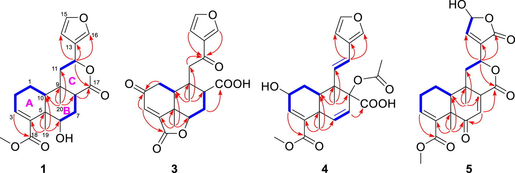 Metabolite 5, a colorless oil, had the molecular formula C21H22O8, as determined by 13C NMR and HRESIMS data. The 1H and 13C NMR data (Tables 1, 2) of metabolite 5 showed a ketone group (δC 200.2), two carbonyl groups [δC 167.0 and 166.5], a β-butenolide moiety [δH 7.31 (1H, brs) and 6.22 (1H, brs); δC 168.5, 145.9, 135.0, and 97.6], two trisubstituted double bonds [δH 6.78 (1H, t, J = 4.0 Hz) and 6.65 (1H, s); δC 148.2, 139.0, 134.2, and 131.0], a methoxy group [δH 3.70 (3H, s); δC 52.1], and two methyl groups [δH 1.44 and 1.26 (each 3H, s); δC 26.2 and 26.1]. The abovementioned data were quite similar to those of tinocordifoliol A (Hoang et al., 2024), with notable differences being the absence of the β-furyl ring in tinocordifoliol A and the presence of a β-butenolide moiety in metabolite 5. HMBC correlations from H-12 (δH 4.93) to the carbons of the β-butenolide moiety (δC 168.5, 145.9, and 135.0) supported the above elucidation. 2D NMR analysis established the molecular structure of metabolite 5. The relative configuration of metabolite 5 was determined by 1D NMR data, compared to the known metabolite, along with the NOESY spectrum (Figure 3). Key NOESY correlations from H3-19 to H-10 assigned these protons as having α-orientation, similar to those of tinocordifoliol A. Thus, NOESY correlations from H-12 to H-10 revealed that H-12 and H-10 were co-facial and in the α-orientation. Thus, metabolite 5 was named tinotanoid M.