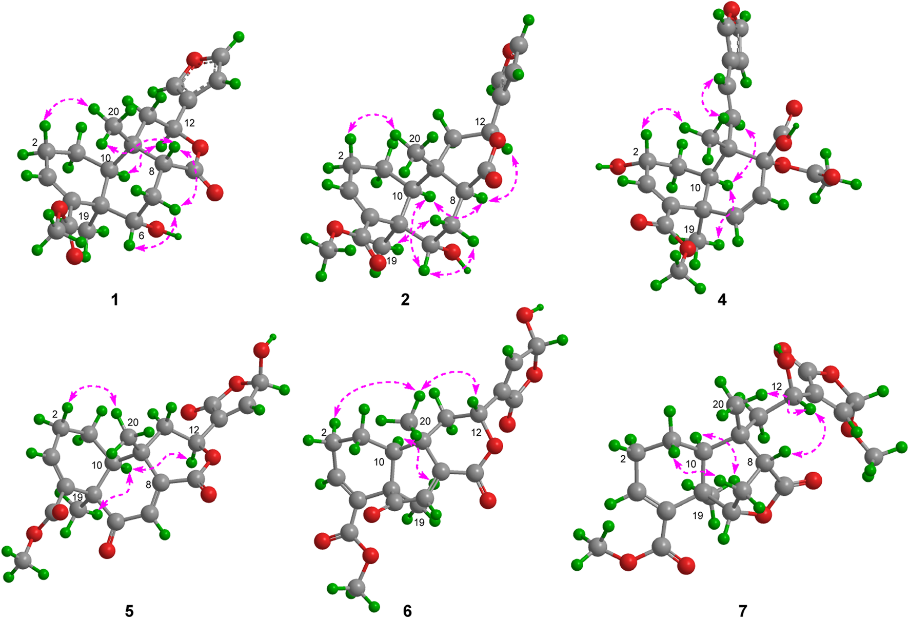 HRESIMS analysis revealed that the molecular ion at m/z 401.1243 of tinotanoid N (6) was consistent with the molecular formula C21H22O8 (calcd 401.1242), indicating that it was an isomer of metabolite 5. Comprehensive analyses of the NMR spectrum revealed that metabolite 6 shared the same planar structure as metabolite 5. The configuration of H-10/H3-19 in the α-orientation, along with H3-20 in the β-orientation, was assigned as the same as in metabolite 5, according to the biosynthesis consideration. A comprehensive analysis of NOESY correlations revealed the signals of H-12/H3-20, indicating that H-12 was in the β-orientation. Thus, metabolite 6 was assigned as 12-isomer of metabolite 5.