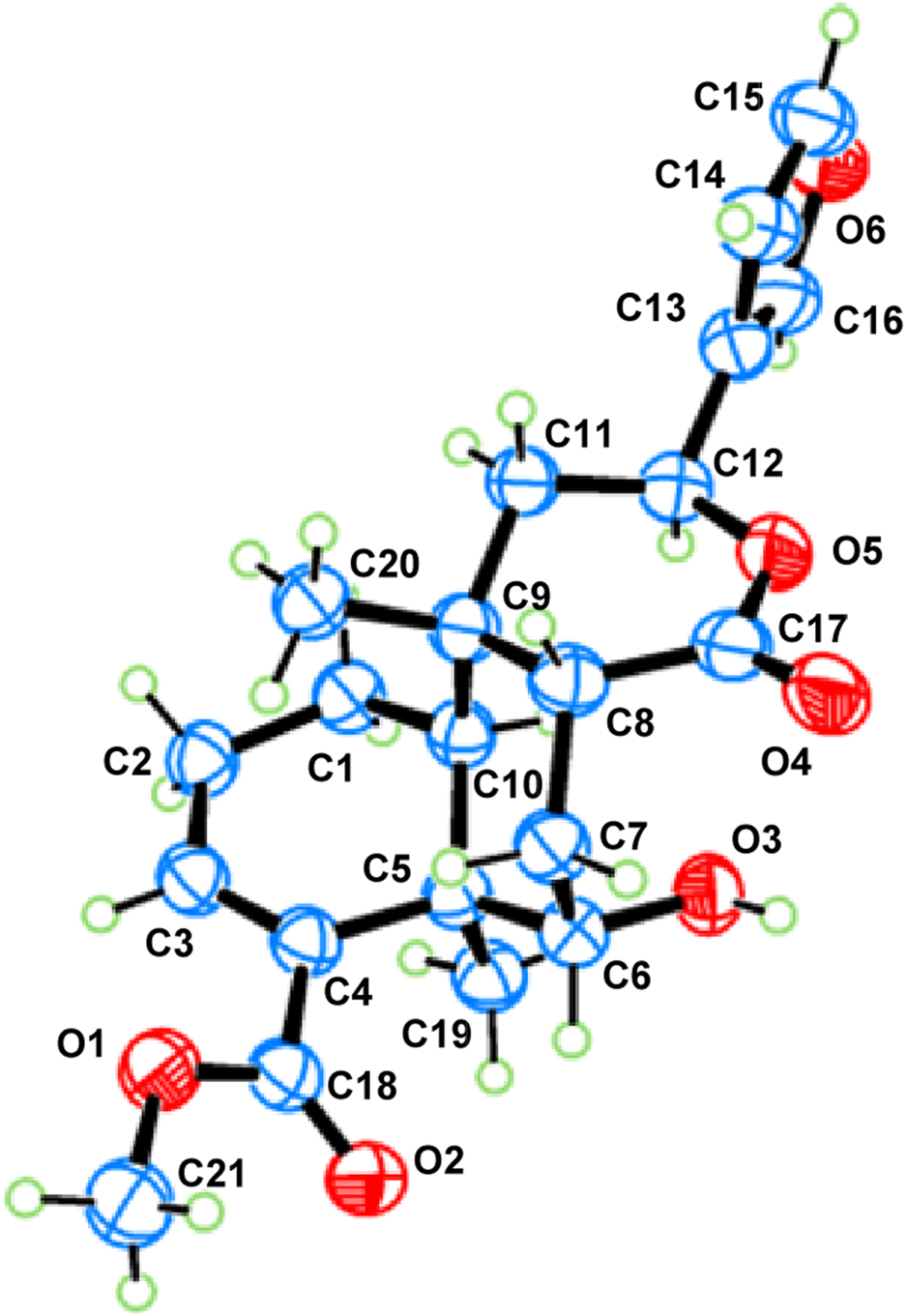 Tinotanoid I (1): Colorless crystal, CCDC 2411568; Flack parameter, 0.10 (5); other crystal data are provided in Supplementary Table S1 in SI; m.p. 136−138°C; [α]25D −180 (c 0.05, MeOH); UV (MeOH) λmax (log ε), 209 nm (3.46) ; ECD (c 5.4 × 10−4 M, MeOH) λmax (Δε), 239 nm (−11.49); 1H and 13C NMR data are provided in Tables 1, 2; HRESIMS m/z 375.1805 [M + H]+ (calcd for C21H27O6+, 375.1802).