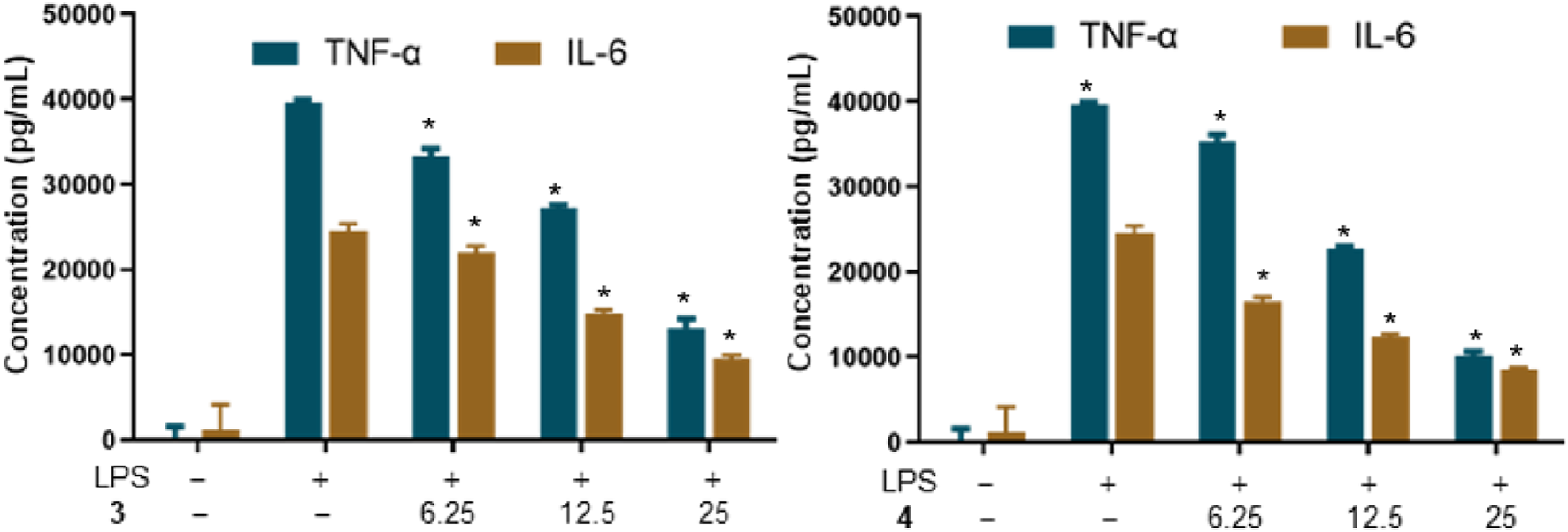 RAW264.7 macrophages were pretreated with 3 and 4 for 1 h prior to the stimulation with LPS (0.1 μg/mL) for 6 h. The concentrations of TNF-α and IL-6 in the culture medium were determined using commercial ELISA kits, according to the instructions of each manufacturer.