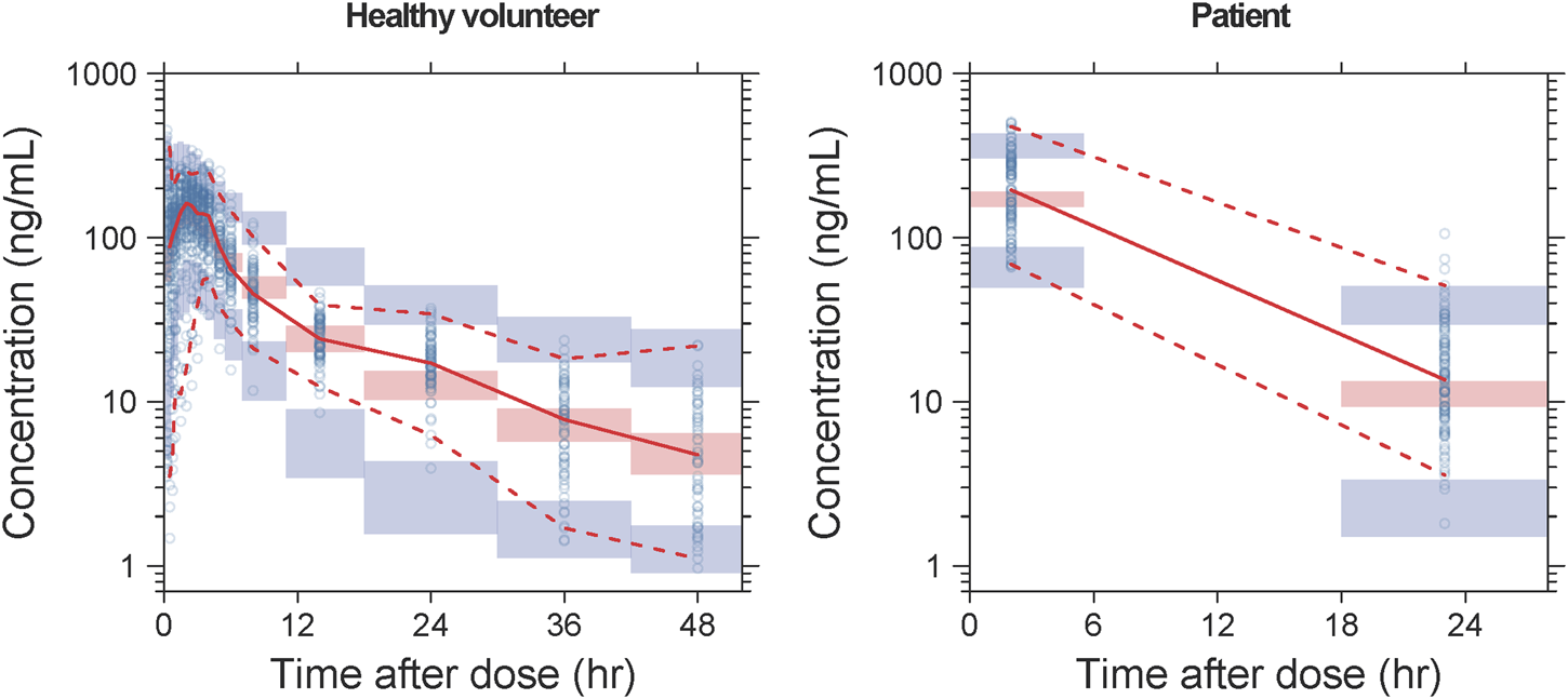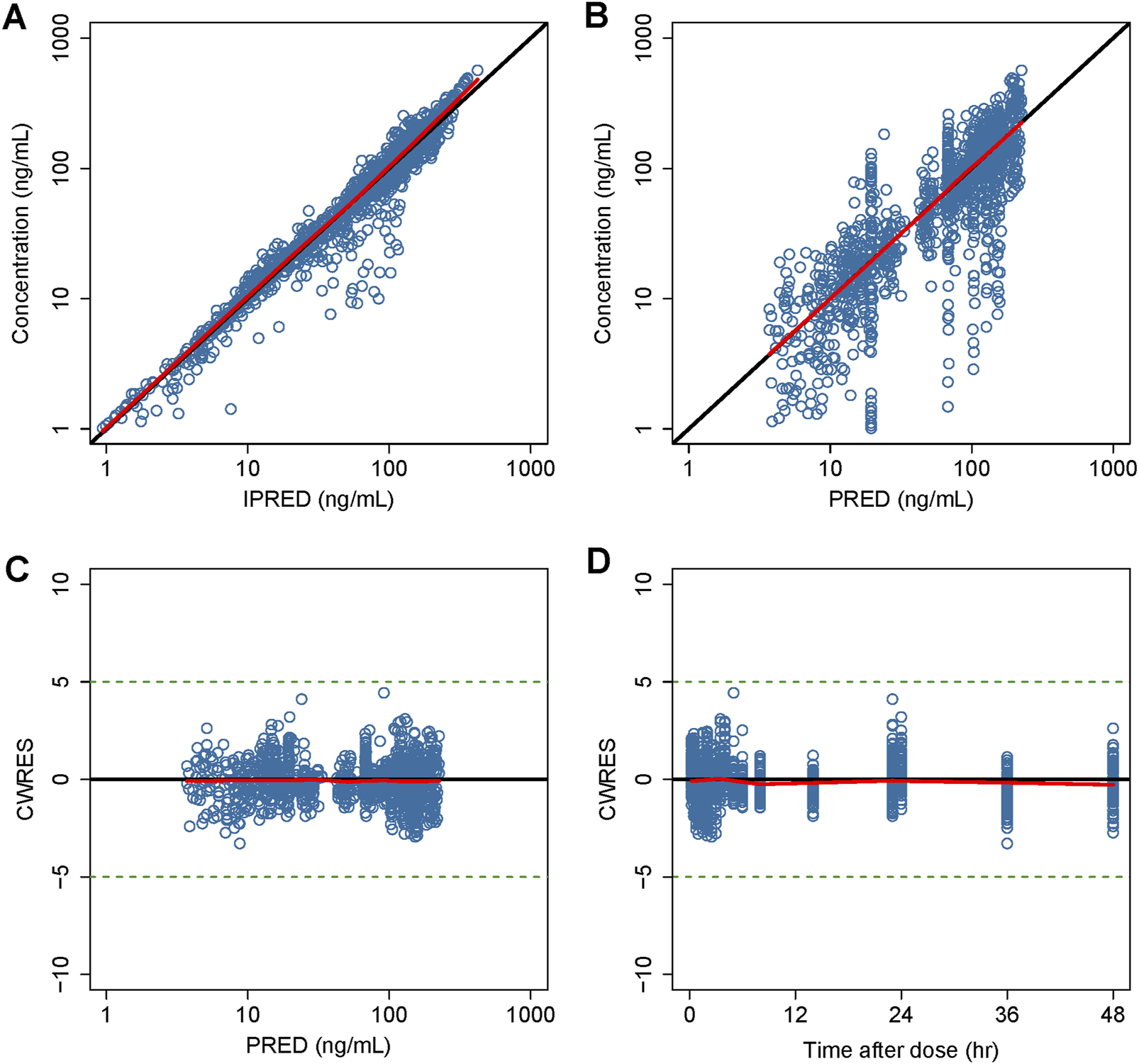 The interindividual variability (IIV) of each PK parameter was assessed using the following equation:where θi is the PK parameter for the ith subject, θT is the typical population value of the PK parameter, and ηi represents the random interindividual variability, which follows a normal distribution with a mean of 0 and variance of ω2. Residual variability (RV) was described as follows:where C(t)ij and Ĉ(t)ij represent the jth observed and model-predicted concentrations for the ith subject, respectively, and ε1ij and ε2ij are the proportional and additive residual errors for the jth observed concentration of the ith subject, which are independent and follow normal distributions with means of 0 and variances of σ12 and σ22, respectively.