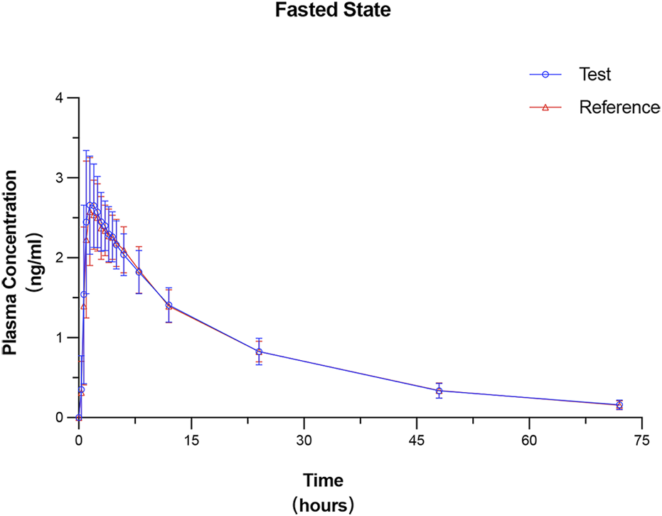 All 24 subjects completed both the fasted and fed trials. No significant differences were found in the PK data between the test and reference formulations for either the fasted or fed states. The Wilcoxon signed-rank test of Tmax revealed no significant differences between the two formulations in both the fasted (P = 0.319) and fed (P = 0.973) states. The 90% confidence intervals (CIs) for the bioequivalence parameters fell within the 80%–125% range, which meets the standard bioequivalence acceptance criteria. Additionally, there were no significant differences in the incidence of adverse events (AEs) between the generic and branded formulations, and no serious AEs were reported throughout the trial period.
