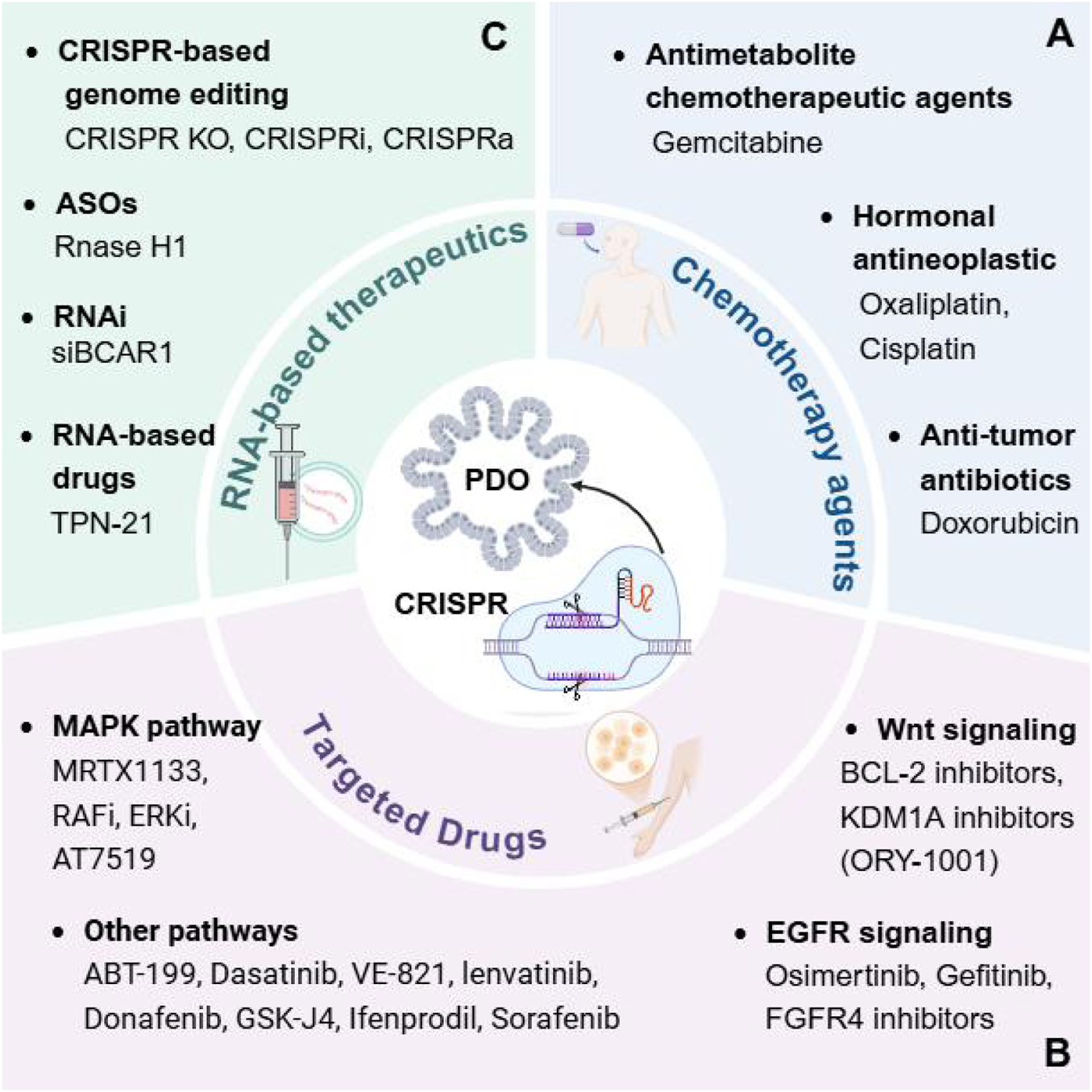 Using CRISPR screens in cancer organoids to identify different cancer therapeutics. CRISPR screens for drugs in different cancer PDOs, such as chemotherapy agents (A), targeted drugs (B), and RNA-based therapeutics (C), which in combination with potential therapeutic targets in the screened tumors can reverse resistance or combine them to further improve drug efficacy.