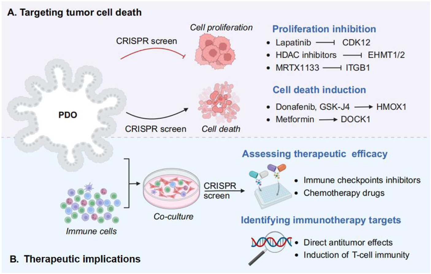 Using CRISPR screens in PDOs for cancer treatment strategies. (A) Targeting tumor cell death. The role of phenotype related genes and drugs in tumor cell death mechanism, including inhibition of cell proliferation (e.g., CDK12, EHMT1/2, and ITGB1), and induction of cell death (e.g., HMOX1 and DOCK1). (B) Therapeutic implications. By incorporating immune cells into PDO culture, followed by CRISPR screening to assess the efficacy of drug therapy and identify the immunotherapy targets.