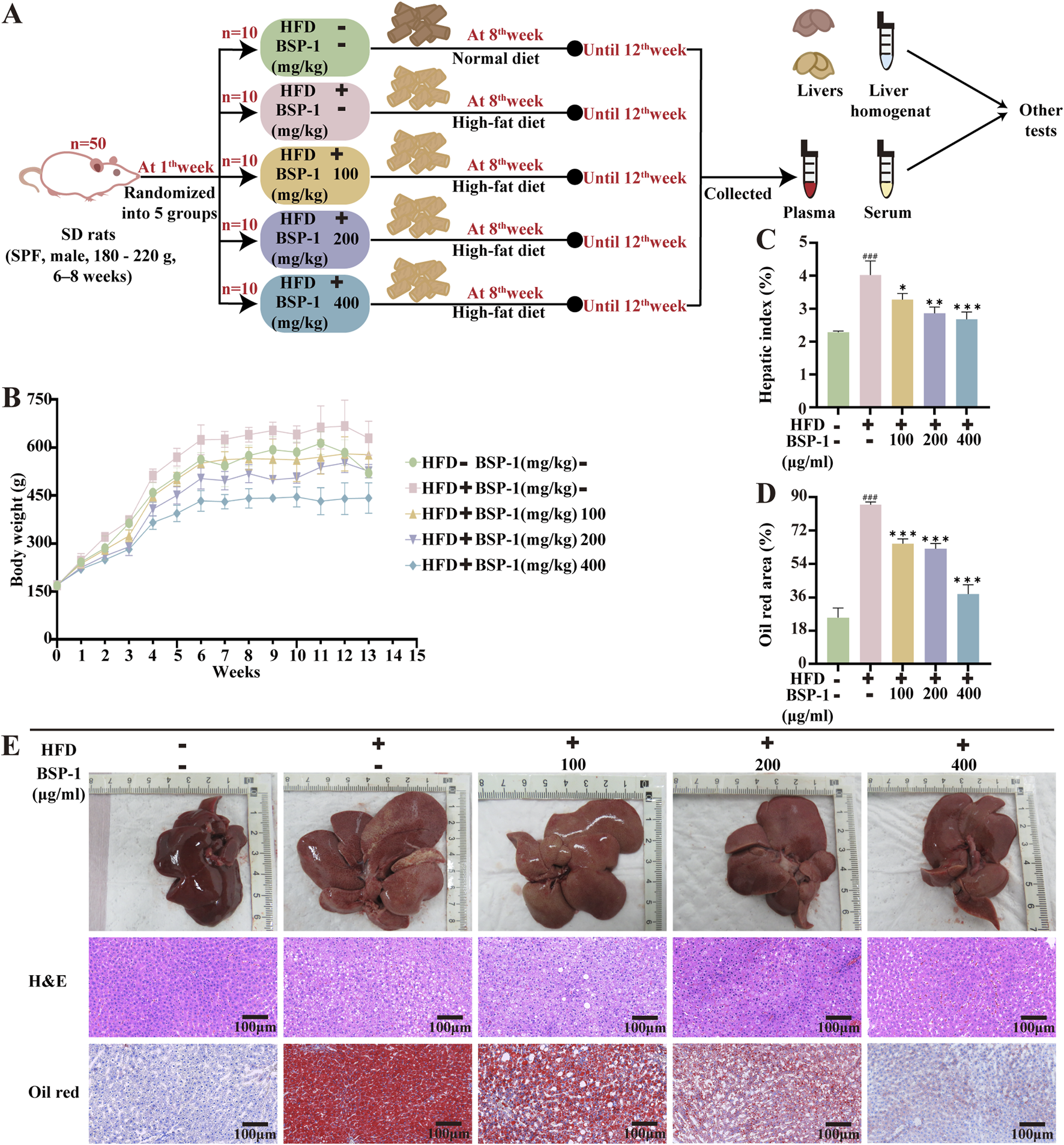 Brief steps of in vivo experiments, observation and recording of rat body weight, and pathological changes in liver tissue. (A) Grouping of experimental Animals. (B) The body weight of rats. (C) The hepatic index of rats. (D) The oil red area of liver tissue in rats. (E) The effect of BSP-1 on liver tissue in rats (anatomical observations and H&E stainning, Oil red stainning, 100 ×). The data are shown as the means ± SDs. #p < 0.05, ##p < 0.01, ###p < 0.001, vs. the control group; *p < 0.05, **p < 0.01, ***p < 0.001, vs. the model group.