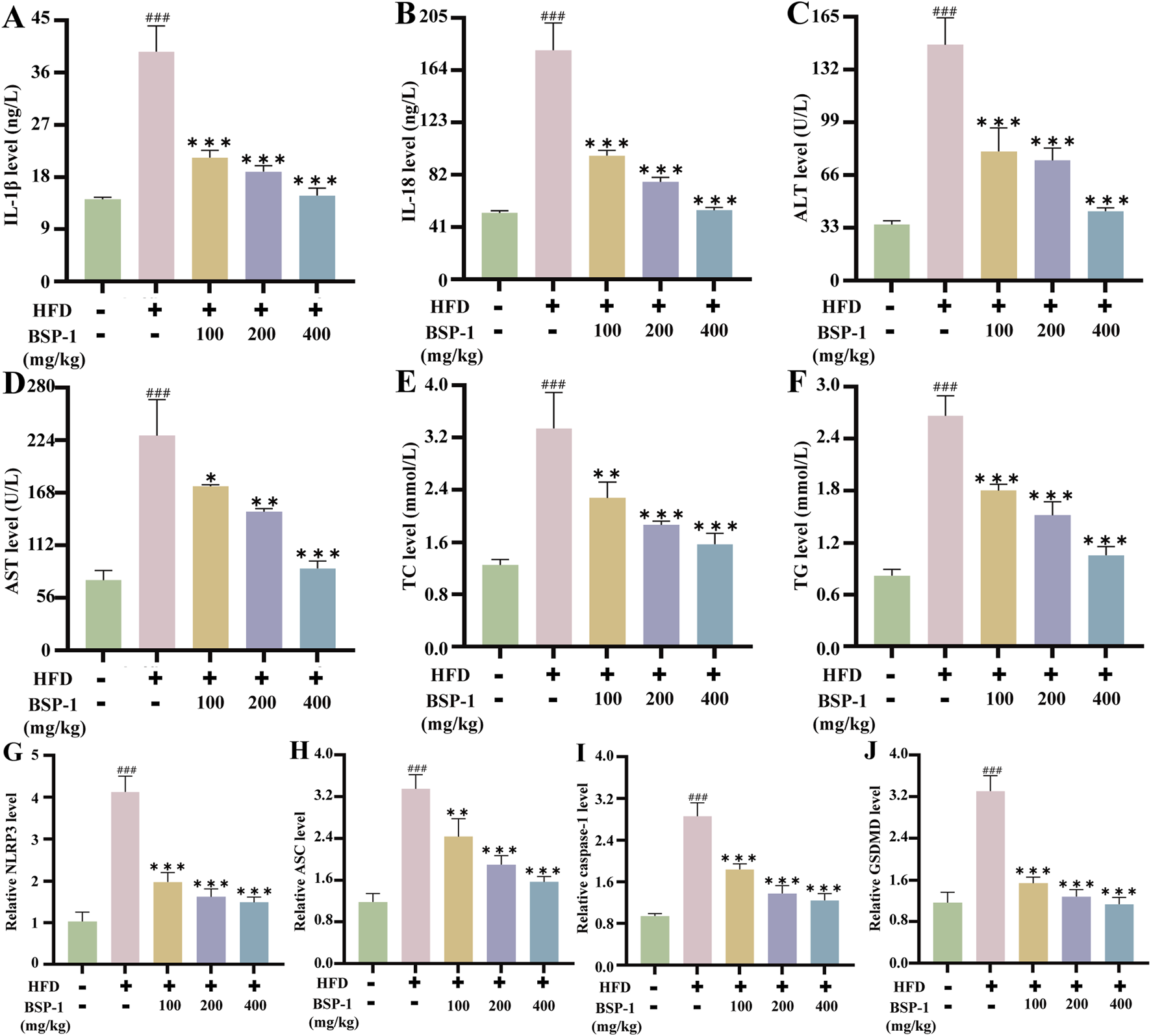 Measurement of IL-1β, IL-18, TC, TG, liver function in rat serum and qRT-PCR analysis in rat liver tissue. The measurement of (A) IL-1β (B) IL-18 (C) ALT (D) AST (E) TC (F) TG in rat serum. The mRNA levels of (G) the NLRP3 (H) the ASC (I) the caspase-1 (J) the GSDMD in rat liver tissue. The data are shown as the means ± SDs. #p < 0.05, ##p < 0.01, ###p < 0.001, vs. the control group; *p < 0.05, **p < 0.01, ***p < 0.001, vs. the model group.
