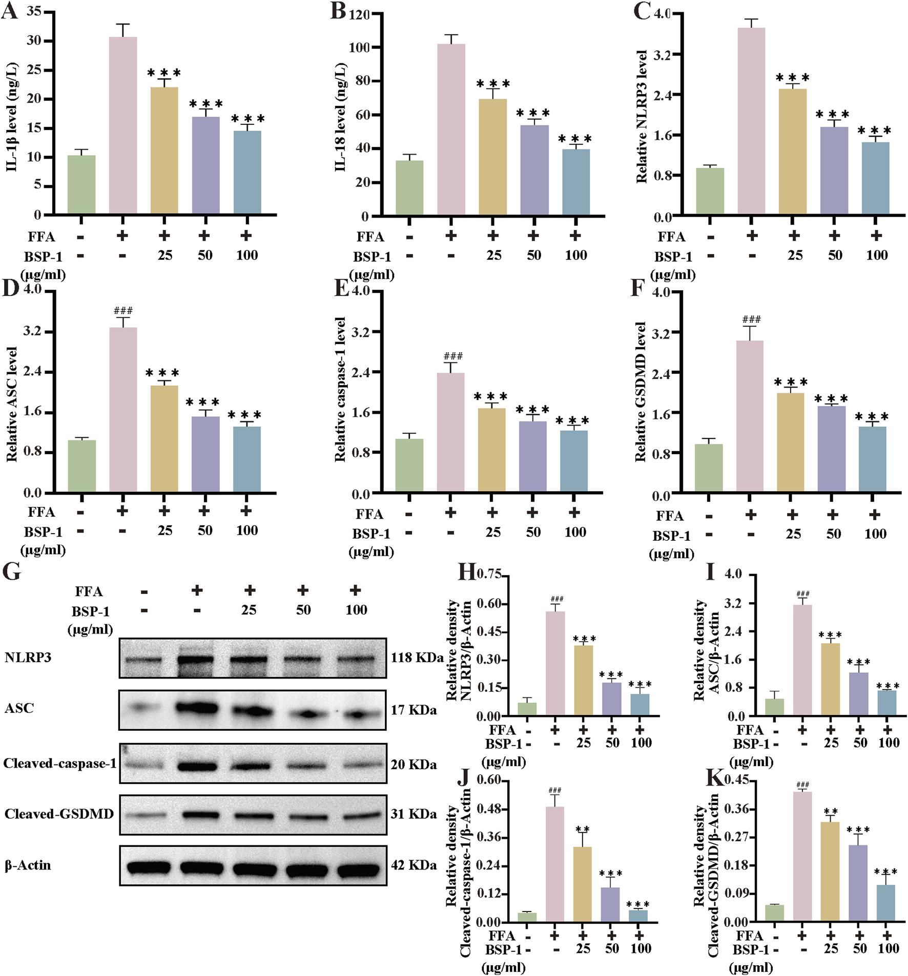 Measurement of IL-1β and IL-18, qRT-PCR and WB analysis in HepG2 cells. The measurement of (A) IL-1β and (B) IL-18 in HepG2 cells. The mRNA levels of (C) the NLRP3 (D) the ASC (E) the caspase-1 and (F) the GSDMD in HepG2 cells. (G) The WB analysis in HepG2 cells. (H) The NLRP3/β-Actin (I) the ASC/β-Actinof (J) the Cleaved-caspase-1/β-Actin and (K) the Cleaved-GSDMD/β-Actinof WB in HepG2 cells. The data are shown as the means ± SDs. #p < 0.05, ##p < 0.01, ###p < 0.001, vs. the control group; *p < 0.05, **p < 0.01, ***p < 0.001, vs. the model group.
