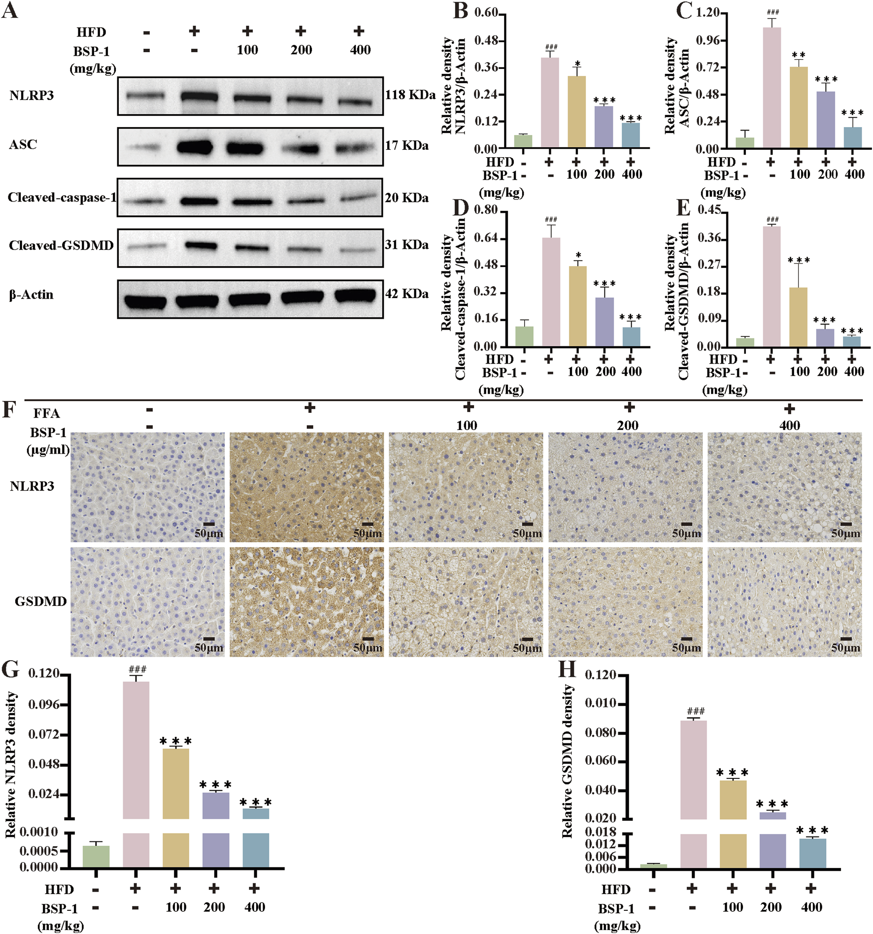 The WB analysis and immunohistochemical staining in rat liver tissue. (A) The WB analysis in rat liver tissue. (B) The NLRP3/β-Actin (C) the ASC/β-Actinof (D) the Cleaved-caspase-1/β-Actin and (E) the Cleaved-GSDMD/β-Actinof WB in rat liver tissue. (F) The evaluation of NLRP3 and GSDMD immunohistochemical staining (200 ×). The immunohistochemical density of (G) the NLRP3 and (H) the GSDMD in rat liver tissue. The data are shown as the means ± SDs. #p < 0.05, ##p < 0.01, ###p < 0.001, vs. the control group; *p < 0.05, **p < 0.01, ***p < 0.001, vs. the model group.