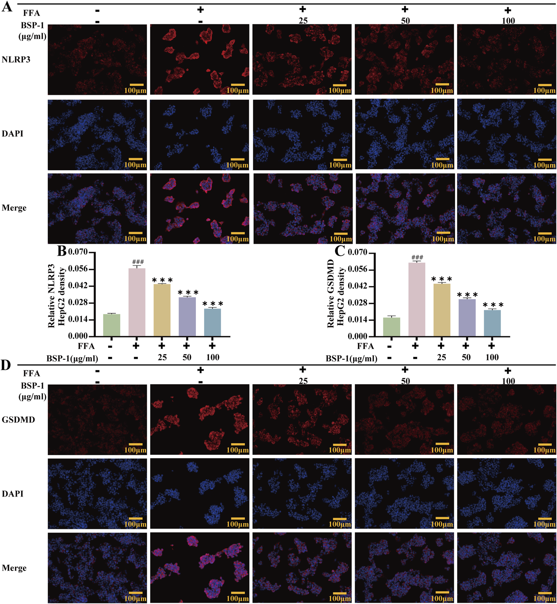 Immunofluorescence of HepG2 Cells. (A) The evaluation of NLRP3 immunofluorescence staining (100 ×). The immunohistochemical density of (B) the NLRP3 and (C) the GSDMD in HepG2 cells. (D) The evaluation of GSDMD immunofluorescence staining (100 ×). The data are shown as the means ± SDs. #p < 0.05, ##p < 0.01, ###p < 0.001, vs. the control group; *p < 0.05, **p < 0.01, ***p < 0.001, vs. the model group.
