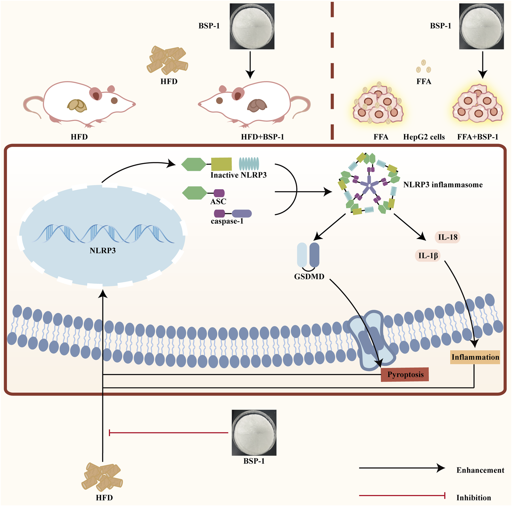 MASLD is closely related to chronic inflammation of the liver. The NLRP3 inflammasome is essential for the progression of chronic inflammation and has recently become a potential new therapeutic target for MASLD (Chan et al., 2023; Hutchison et al., 2023). It is ubiquitously present in hepatic immune and parenchymal cells and effectively recognizes disturbances caused by PAMPs and DAMPs in the hepatic cellular milieu, thereby exerting innate immune functions (Sharma and Kanneganti, 2021). In general, the levels of the sensor NLRP3, the adapter ASC, and the effector caspase-1 within the multi-molecular protein complex NLRP3 inflammasome remain relatively stable and low. Although immune cells, upon sensing PAMPs and DAMPs, activate the NF-κB signaling pathway to increase the expression of NLRP3 genes, thereby elevating their numbers, post-translational modifications such as ubiquitination, phosphorylation, and sumoylation, along with interactions between NLRP3 and organelles, further regulate immune cells to prevent easy activation of the NLRP3 inflammasome in response to stimulation (Swanson et al., 2019). Once activated in macrophage- and monocyte-dominant liver sites, the NLRP3 inflammasome triggers the production of pro-inflammatory cytokines, lysosomal damage, and increased reactive oxygen species, further inducing the transcription of NLRP3 genes. Additionally, the prion-like polymerization of fibrils formed during the docking of the PYD domains of NLRP3 and ASC facilitates the recruitment of caspase-1 by the caspase recruitment domain of ASC. The activated NLRP3 inflammasome mainly induces pyroptosis by cleving GSDMD, allowing its N-terminal domain to bind to the cell membrane and form pores. Meanwhile, it promotes the secretion of extracellular active pro-inflammatory cytokines IL-1β and IL-18 (Hooftman et al., 2020), which intensifies the liver inflammatory response and accelerates the development of MASLD. In our study, we found that BSP-1 could effectively weaken the protein and mRNA expressions of NLRP3, ASC, caspase-1 and GSDMD, indicating that the NLRP3 inflammasome-related pathway was inhibited. In the rat model induced by HFD, immunohistochemical analysis also showed that BSP-1 could improve the expression of NLRP3 and GSDMD proteins in liver tissues. The same conclusion was reached by immunofluorescence detection of the expression of NLRP3 and GSDMD proteins in the HepG2 cells model induced by FFA. Furthermore, BSP-1 also inhibits the production of pro-inflammatory cytokines IL-1β and IL-18 in the HFD-induced rat and FFA-induced HepG2 cells, which further indicates its inhibitory effect on liver inflammation. Therefore, BSP-1 plays a role in alleviating MASLD by preventing steatosis, inflammation, and pyroptosis, which may be relate to the inhibition of NLRP3/caspase-1/GSDMD signaling pathway (Figure 9).