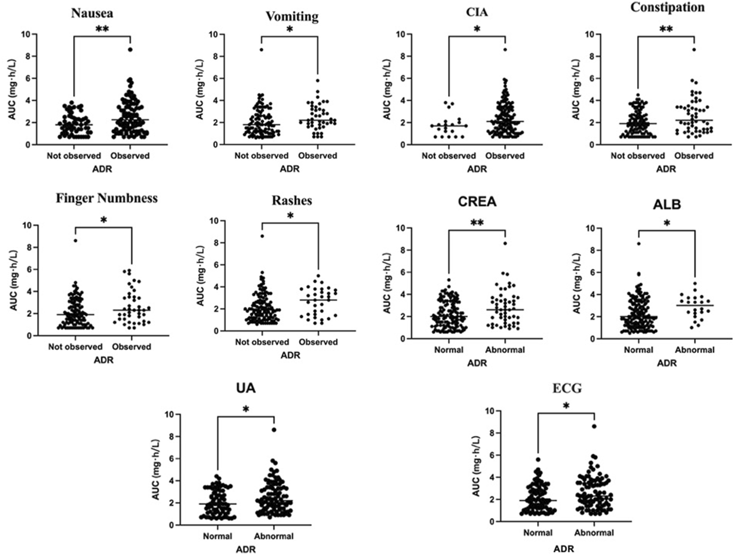 The adverse reactions of chemotherapy were matched with different docetaxel AUC results through univariate analysis. The patients between the groups were no statistically significant differences in terms of demographic and tumor data, including age, height, weight, BSA, and body mass index (p > 0.05). Univariate analysis revealed significant differences in albumin (ALB) levels (p = 0.037), creatinine (CREA) levels (p = 0.002), nausea occurrence (p = 0.008), vomiting occurrence (p = 0.013), rashes occurrence (p = 0.002), and chemotherapy-induced alopecia incidence (CIA) (p = 0.002). Based on the results of the univariate analysis, binary logistic regression analysis was further conducted to identify predictors contributing to the occurrence of chemotherapy adverse reactions. The results demonstrated that an AUC value greater than 2.5 mg h/L was significantly associated with increased risk of certain adverse reactions such as rashes, CIA, CREA, and ALB.