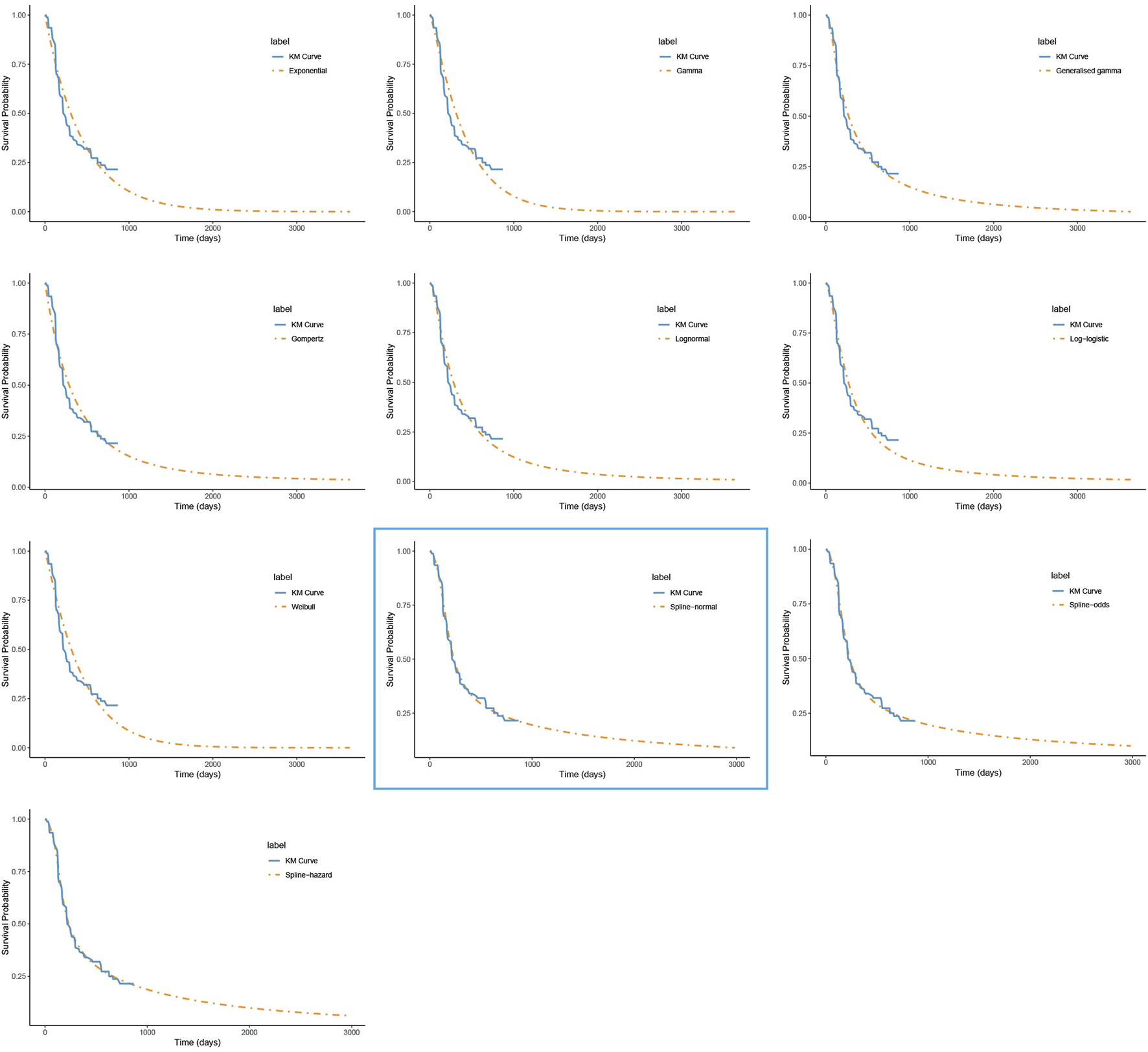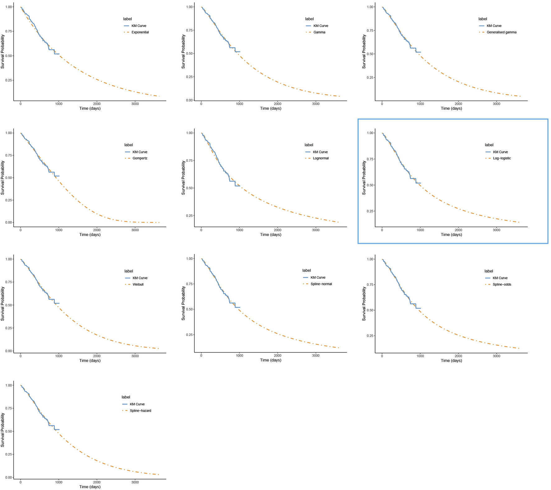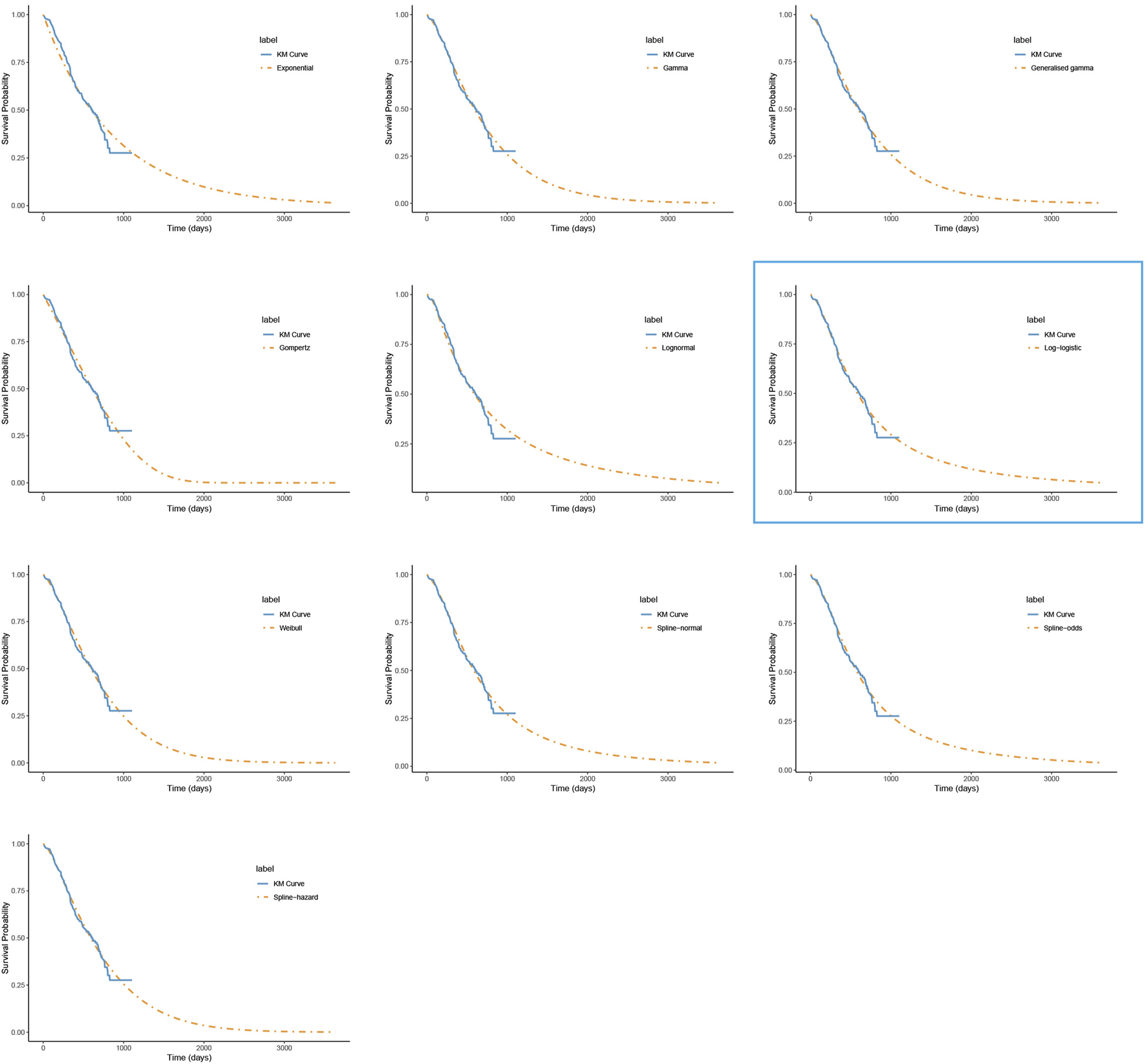 The fitted overall survival curves for the placebo group. *The distribution model selected in the blue box represents the one used in the base-case analysis.