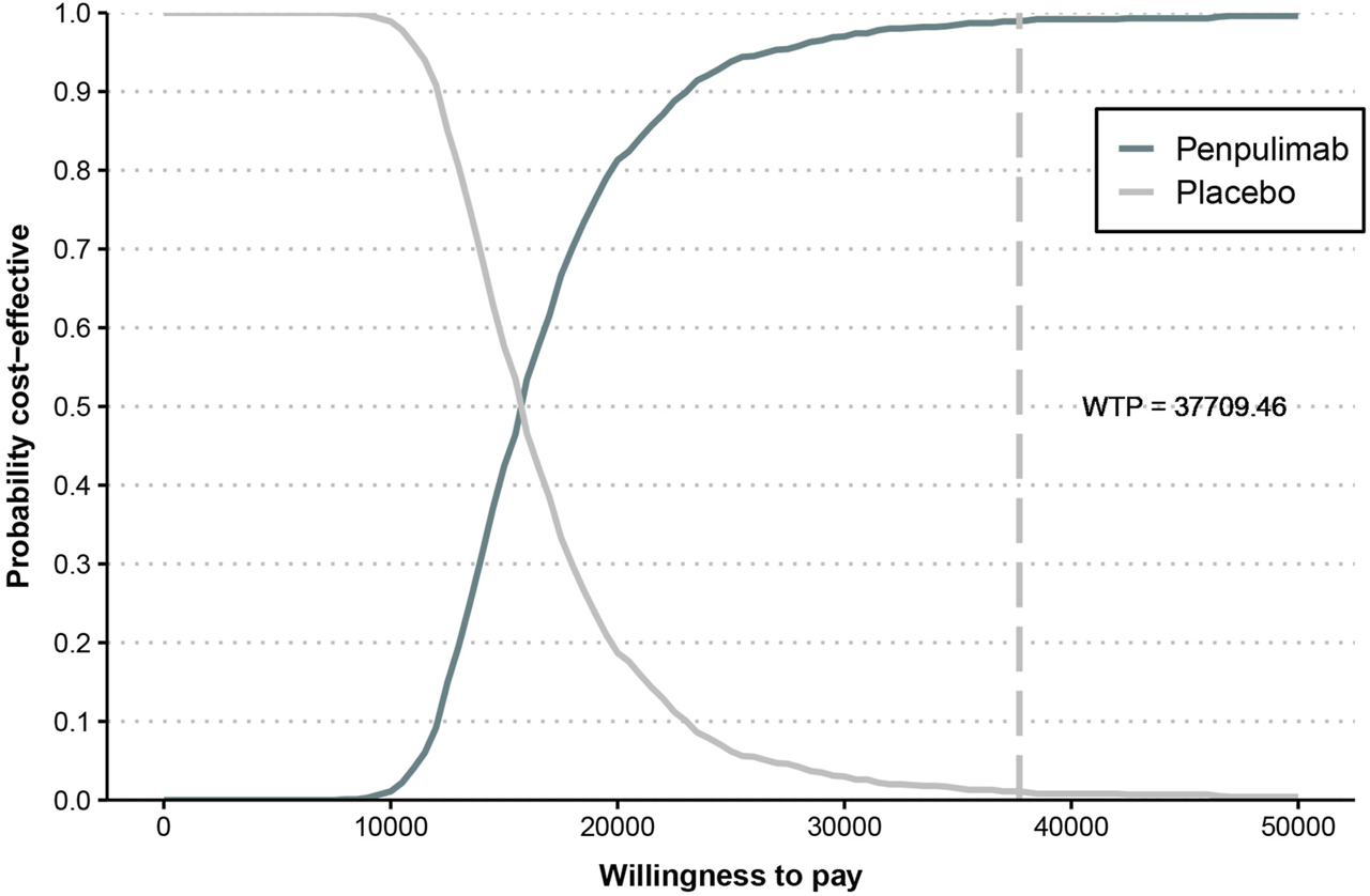 The incremental cost-effectiveness ratio (ICER) for the penpulimab group compared to the placebo group was $16,105.90 per quality-adjusted life year (QALY), which falls below the willingness-to-pay (WTP) threshold of $37,709.46 per QALY. Deterministic sensitivity analysis identified the three most influential factors affecting model outcomes: discount rate, costs associated with progressive disease, and utility value for progression-free survival. Probabilistic sensitivity analysis indicated that at a WTP threshold of $37,709.46 per QALY, the probability of penpulimab being cost-effective reached 99%. Scenario analyses demonstrated that, while the base-case results were generally robust, the cost-effectiveness of penpulimab remained sensitive to the limited maturity of overall survival (OS) data in the penpulimab group. The immaturity of the OS data increased the extrapolation uncertainty, which could potentially alter the economic conclusions.