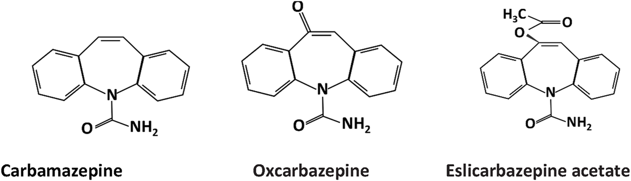 Chemical structure of dibenzazepine carboxamides .CBZ, OXC, and ESL all have a dibenzazepine nucleus bearing a 5-carboxamide substitute.